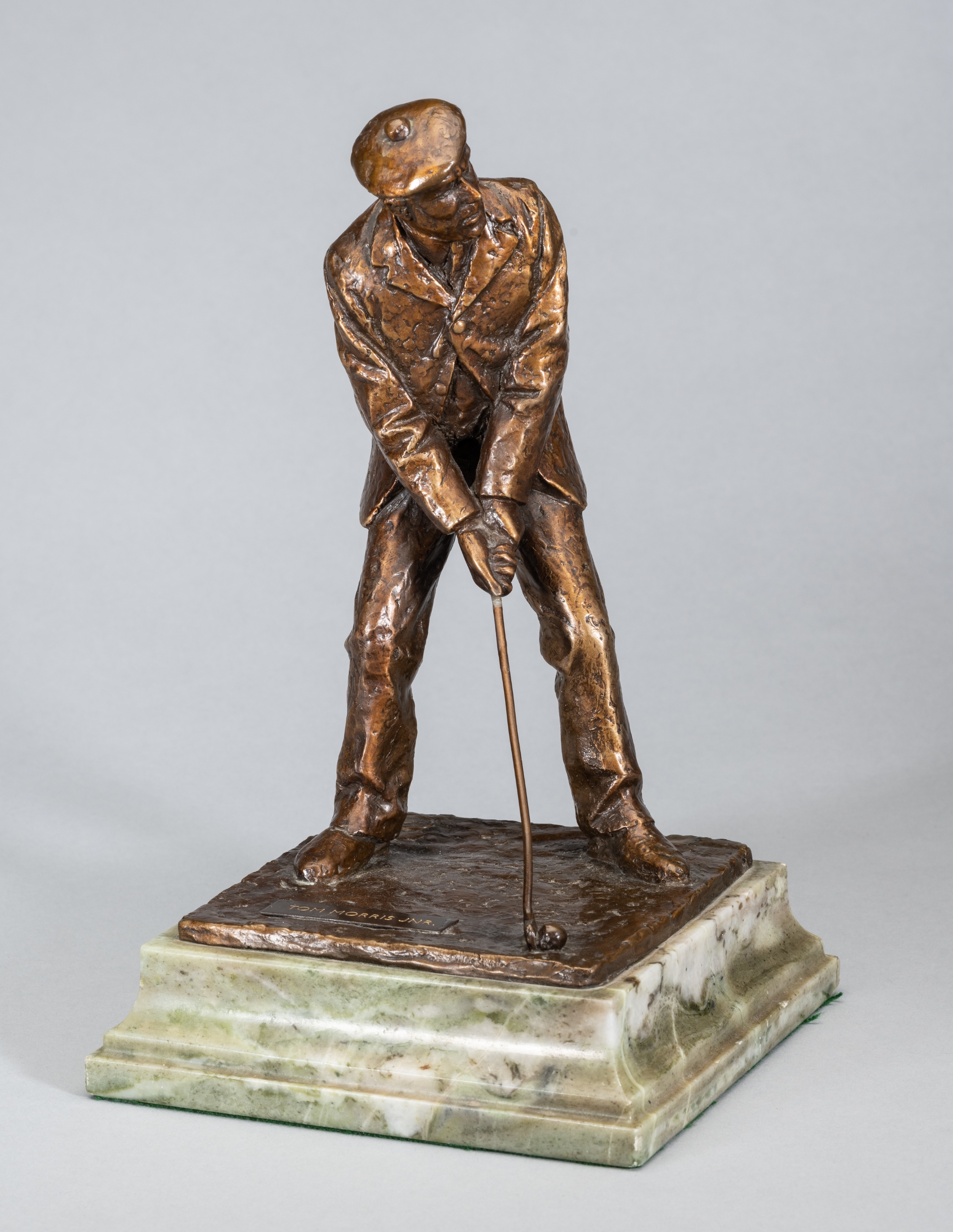 Tom Morris Jnr. bronze figural sculpture by Garrard & Co Ltd., depicting Tom Morris Jnr. lining up to chip the ball, standing on a bronze plinth moun