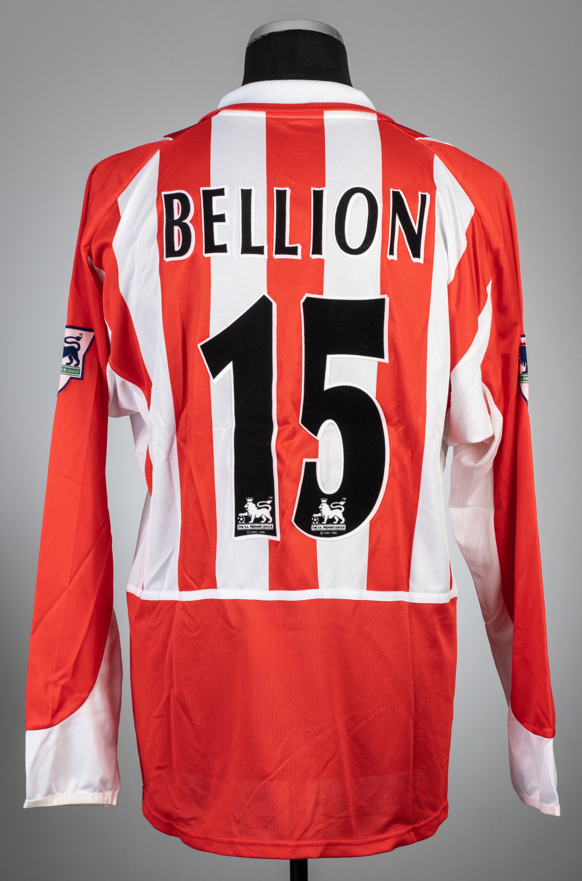 David Bellion red and white striped Sunderland no.15 home jersey, season 2002-03, Nike, long-sleeved with THE FA PREMIER LEAGUE sleeve badges, club crest and sponsor logo, reverse lettered BELLION, size 42/44in. UK