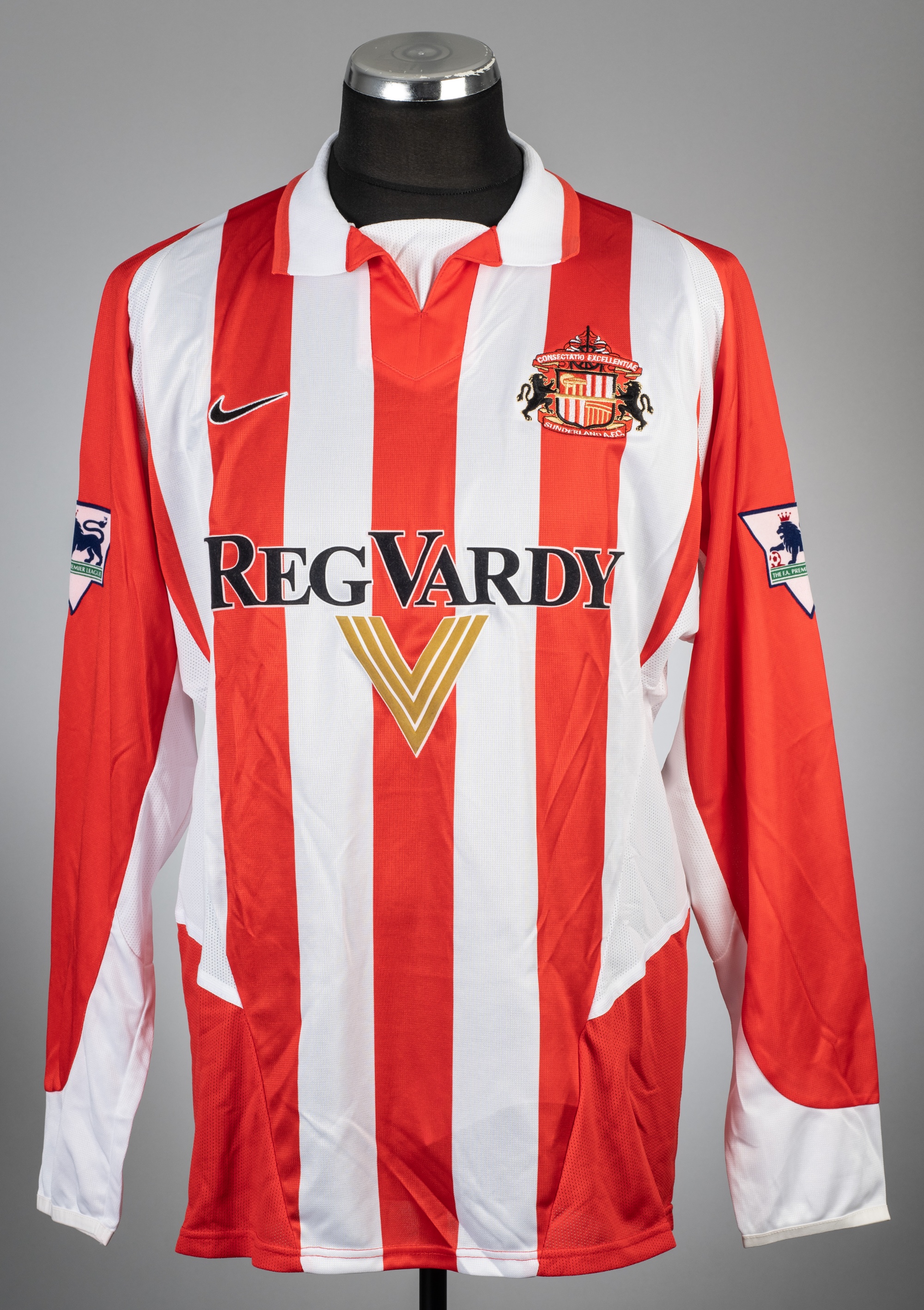 David Bellion red and white striped Sunderland no.15 home jersey, season 2002-03, Nike, long-sleeved with THE FA PREMIER LEAGUE sleeve badges, club c