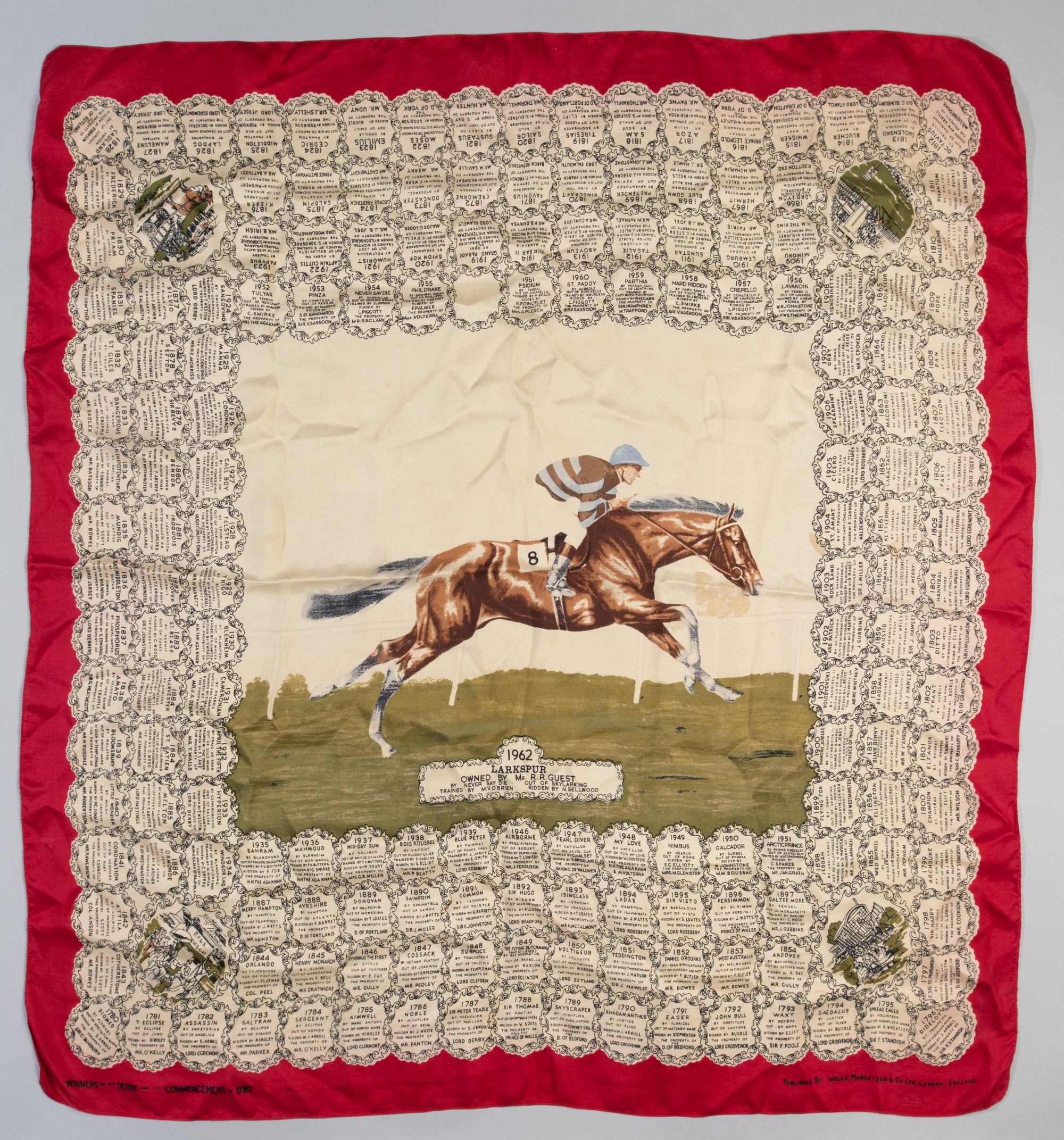 A ladies silk scarf commemorating the victory of Mr Guest's Larkspur in the 1962 Derby, featuring horse and jockey in central image above cartouche with 1962 LARKSPUR OWNED BY MR R.R. GUEST, BY NEVER SAY DIE, OUT OF SKYLARKING, TRAINED BY M.V. O'BRIEN, RIDDEN BY N. SELLWOOD, surrounded by cartouches of detailing previous Derby winners, 83 by 90cm., minor wear and stains