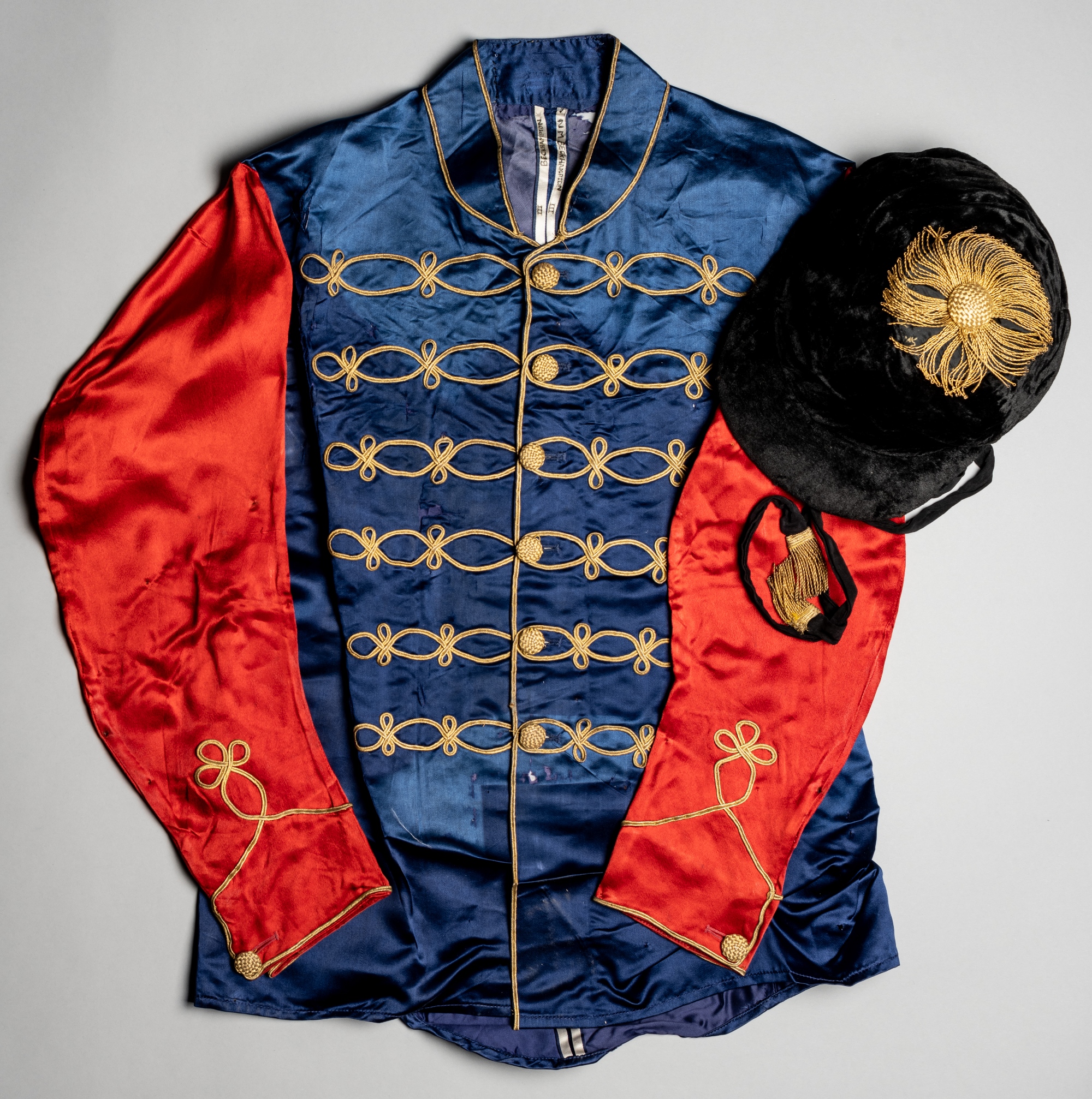 A set of racing colours of HM King George VI originally in the training yard of Noel Murless at Beckhampton circa 1948, purple jacket, scarlet sleeves, black velvet cap, gold braiding and detailing to jacket, gold tassel on cap, the interior inscribed in ink NM [Noel Murless] Beckhampton III, similarly inscribed inside the cap, purple dye faded to an overall blue appearance, minor faults, generally very good Noel Murless took over as the "Master" of Beckhampton stables from Fred Darling in 1948. This directly led to HM King George VI sending Murless horses and indeed he trained three winners for His Majesty during his first season in 1948 which also saw him crowned Champion Trainer for the first time. Provenance: Acquired by Frederick J Chandler Saddlers Ltd of Marlborough and used in a shop display at their London Road premises. The family business was formed in Marlborough in 1796 and held a Royal Warrant for HM The Queen. They also acquired D Gilbert & Son the famous Newmarket-based racing saddlers, a company who themselves held a Royal Warrant.
