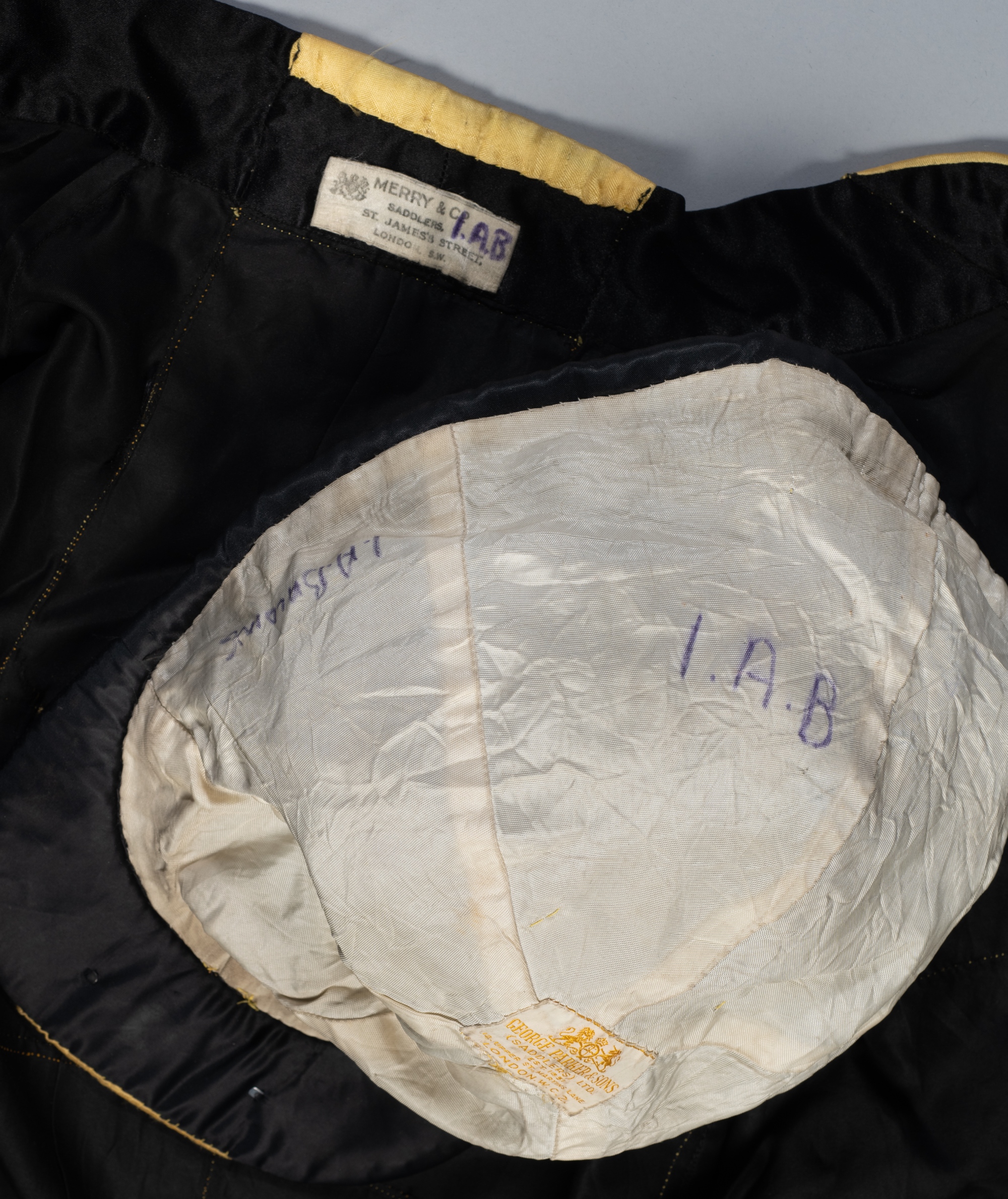 The historic silks worn by jockey Geoff Lewis when riding Mill Reef to victory in the 1971 Epsom Derby, Eclipse Stakes, King George VI and Queen Elizabeth Stakes and Prix de l'Arc de Triomphe, the colours of owner Mr Paul Mellon comprising a black jacket with gold cross and cuffs, the Merry & Co neck label inscribed I.A.B., and left cuff I.A. BALDING, and a black cap with a gold stripe, the cap interior inscribed twice I.A.B. and I.A. BALDING, the cap set with a silver plaque hallmarked Wakely & Wheeler, London, 1971, bearing jockey Geoff Lewis's engraved signature after the inscribed statement: THESE ARE THE COLOURS I WORE WHEN RIDING "MILL REEF" TO WIN THE DERBY - THE ECLIPSE, THE KING GEORGE VI & QUEEN ELIZABETH AND THE PRIX DE LA'ARC [sic] de TRIOMPHE, 1971, small tear to back of jacket close to the neck line and running in close parallel to gold vertical stripe, and another to the back where horizontal gold stripe reaches the shoulder Provenance: Bought at a Charity Auction by the London-based Canadian entrepreneur and financier Douglas H Bayle circa 1971/72, thence gifted to his son. Douglas H Bayle was the Chairman of E&O PLC and is perhaps best remembered for pioneering the Athena chain of poster shops in the 1970s, with the famous Tennis Girl poster selling over 2 million copies alone. Bayle was a regular attendee at black tie dinners organised by The Variety Club and the Anglo-American Sporting Club. Undoubtedly one of the greatest racehorses of the 20th Century, Mill Reef was bred in 1968 by his American owner, Paul Mellon at Upperville, Virginia. Considered better-suited to English turf racing, the small-framed bay colt by Never Bend out of Milan Mill was sent to be trained by Ian Balding at Kingsclere. He won 12 of his 14 starts over a glittering three-year career which included the golden summer of 1971 when, under Geoff Lewis, he carried Mellon’s distinctive black and gold silks to victory in all the top races. Fifty years on, he still remains the only horse ever to have won the Derby, Eclipse, King George VI and Queen Elizabeth Stakes and Prix de l’Arc de Triomphe in the same season. In August 1972, Mill Reef broke a foreleg while in training for a second attempt on the Arc, but skilled surgery together with his placid temperament enabled him to be saved as a highly successful sire of many winners including Derby heroes Shirley Heights and Reference Point. All glass will be removed from framed and glazed items prior to posting and may result in delays to shipping your items. (This service is included in the cost of postage and packing). We can also totally remove all framing and mounts upon request to reduce shipping costs. Alternatively lots can be collected in person by prior appointment from NN8 1RT.