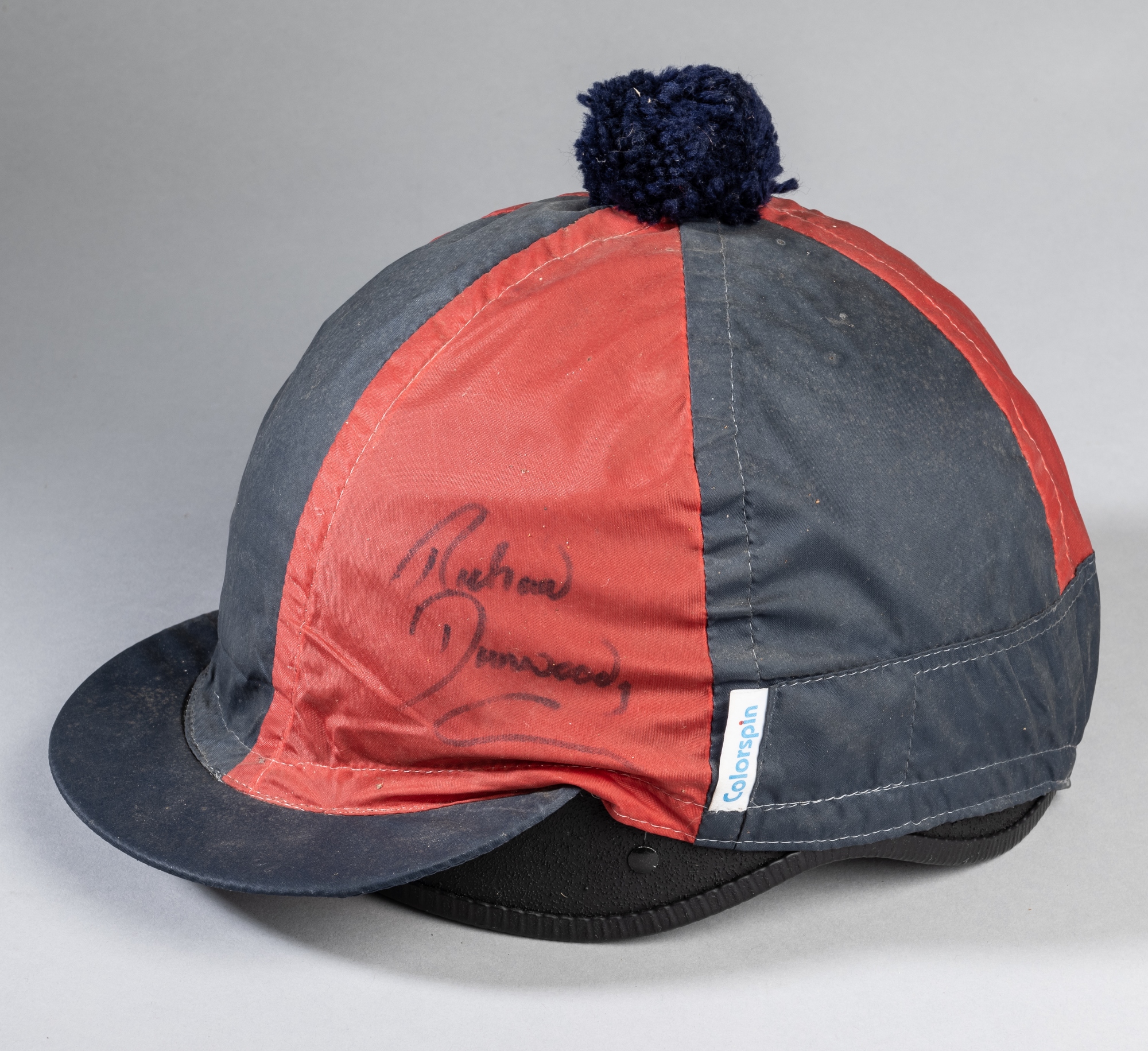 Richard Dunwoody signed racehorse work riding helmet and cover, the COMPETITOR riding helmet with red and navy cover with navy wool pommel, signed in