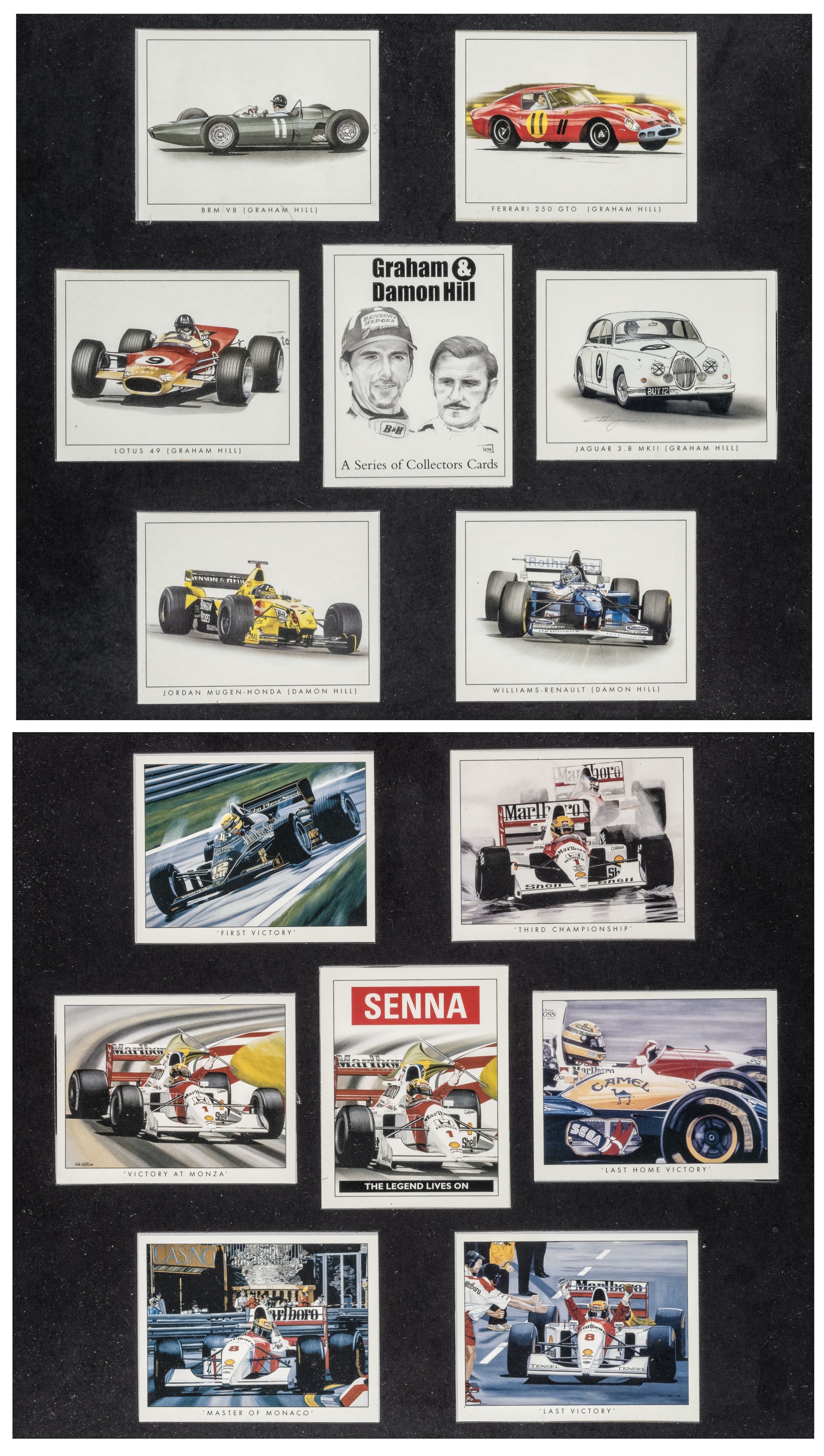 Collection of F1 racing car prints, including Nigel Mansell signed limited edition print of "Red 5 - Double World Champion", 657 of 2000, sold with a Nigel Mansell signed "Mansell's Taxi Service" print and further open edition prints and trade cards, etc., (approx. 25)