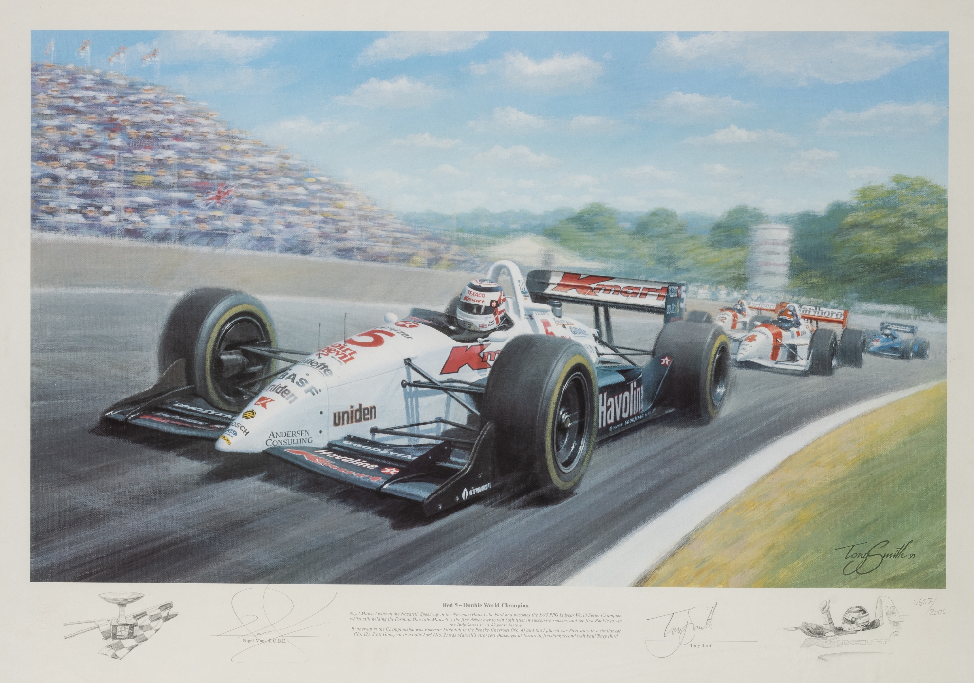 Collection of F1 racing car prints, including Nigel Mansell signed limited edition print of "Red 5 - Double World Champion", 657 of 2000, sold with