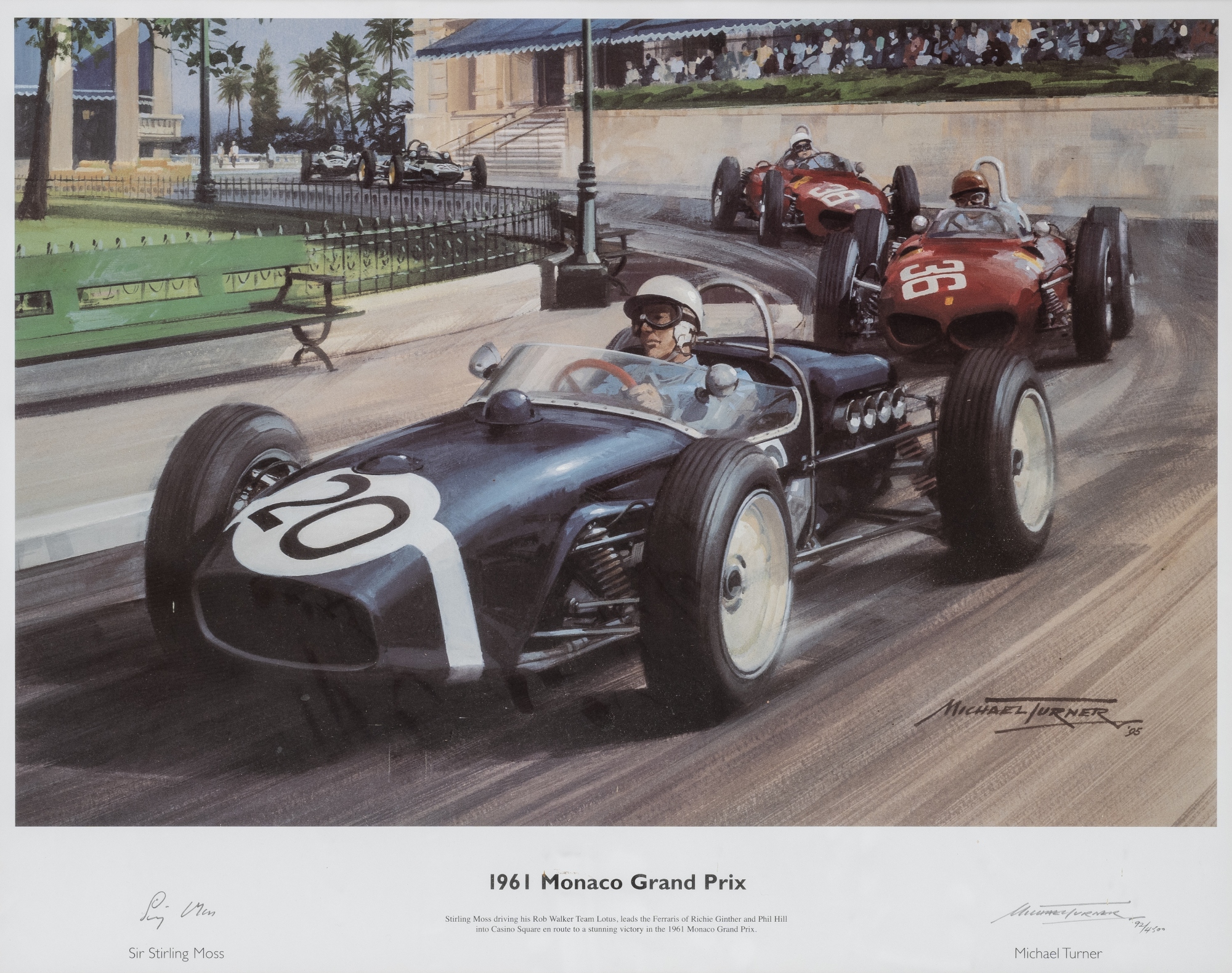 Stirling Moss signed "1961 Monaco Grand Prix" limited edition print by Michael Turner, depicting Stirling Moss in the No.20 Lotus leading the Ferraris of Richie Ginther and Phil Hill into Casino Square, limited edition 92 of 4500, signed by both driver and artist, mounted, glazed and framed, overall 60 by 70cm. All glass will be removed from framed and glazed items prior to posting and may result in delays to shipping your items. (This service is included in the cost of postage and packing). We can also totally remove all framing and mounts upon request to reduce shipping costs. Alternatively lots can be collected in person by prior appointment from NN8 1RT.