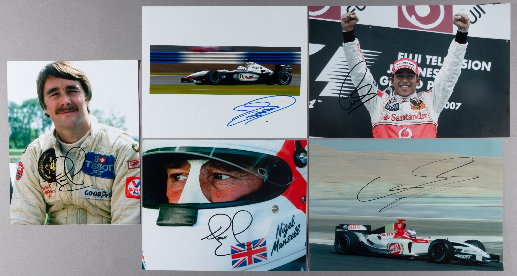 Formula One British racing stars signed photographs, including Sir Lewis Hamilton, Jensen Button, Nigel Mansell (2), David Coulthard, (5)