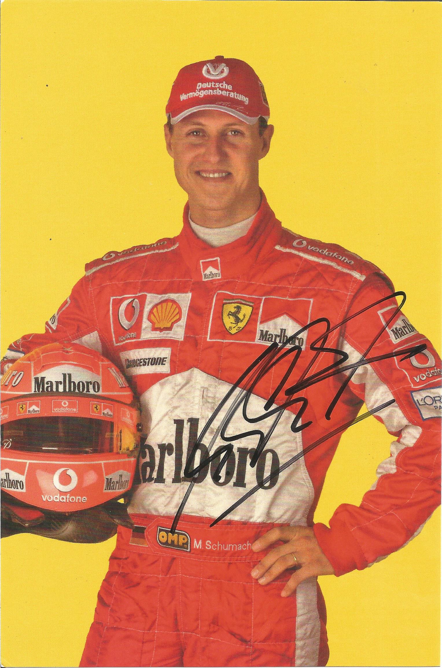 Michael Schumacher seven times F1 World Champion signed and framed display, measuring 69 by 55cm., features an official Ferrari sponsors postcard autographed by Michael that has been mounted within a large headshot image of this racing great, comes with COA All glass will be removed from framed and glazed items prior to posting and may result in delays to shipping your items. (This service is included in the cost of postage and packing). We can also totally remove all framing and mounts upon request to reduce shipping costs. Alternatively lots can be collected in person by prior appointment from NN8 1RT.