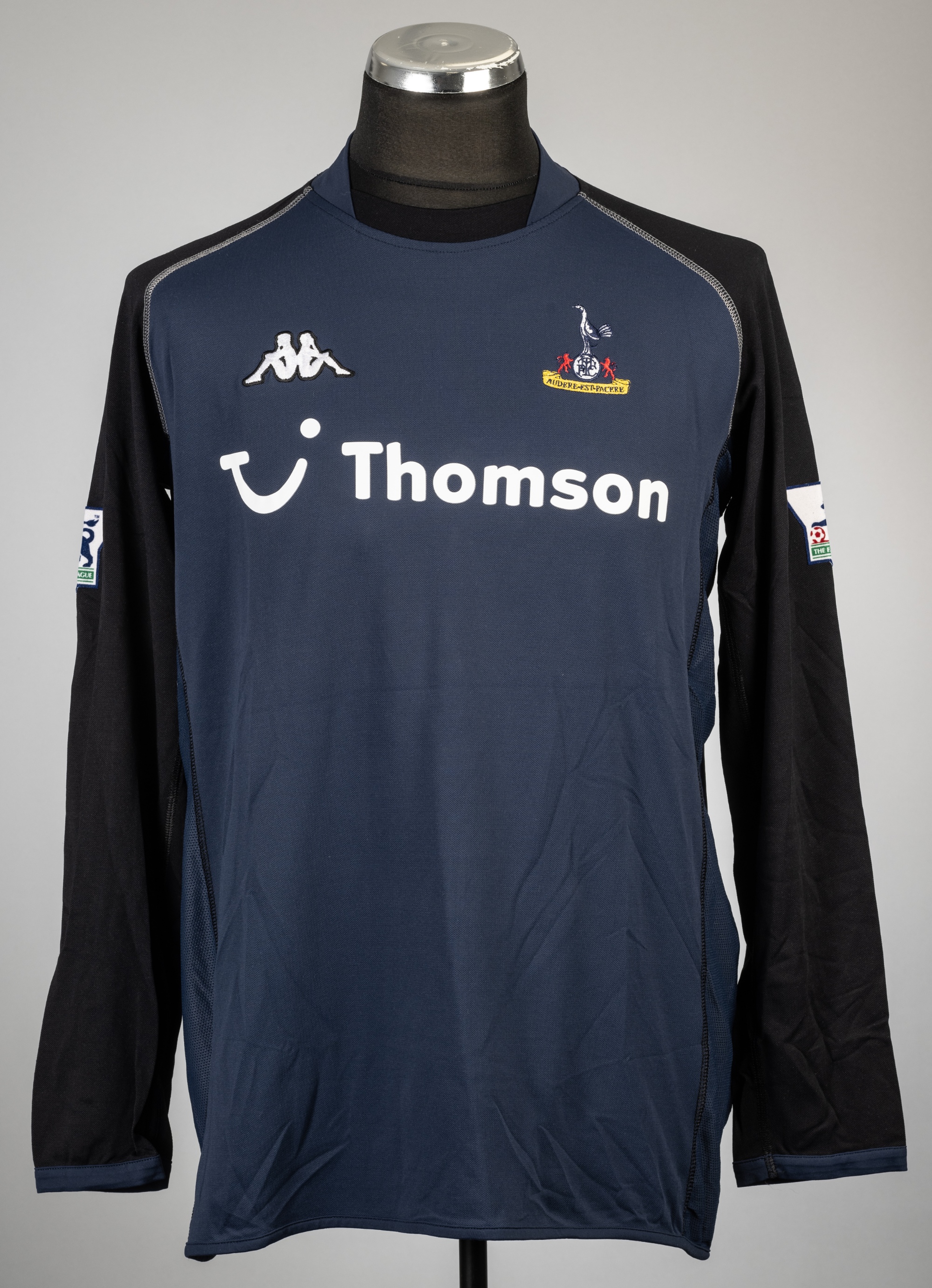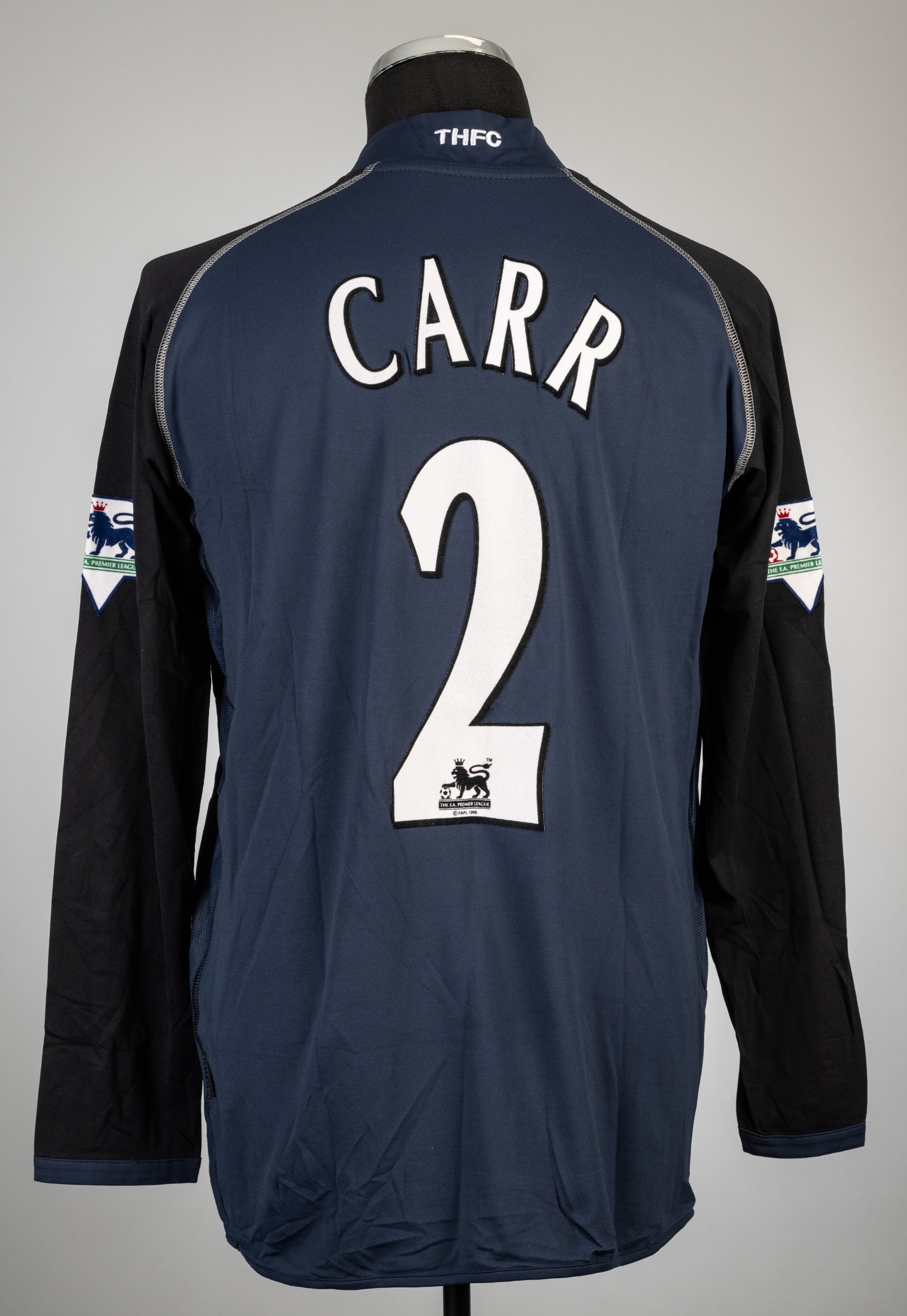 Stephen Carr navy and black Tottenham Hotspur no.2 away jersey v Bolton Wanderers, played at Reebok Stadium, 24th March 2003, Kappa, short-sleeved with THE FA PREMIER LEAGUE sleeve badges, club crest and sponsor logo, reverse lettered CARR, no size label, bears inner seam label Bolton Wanderers defeated Tottenham Hotspur 1-0.