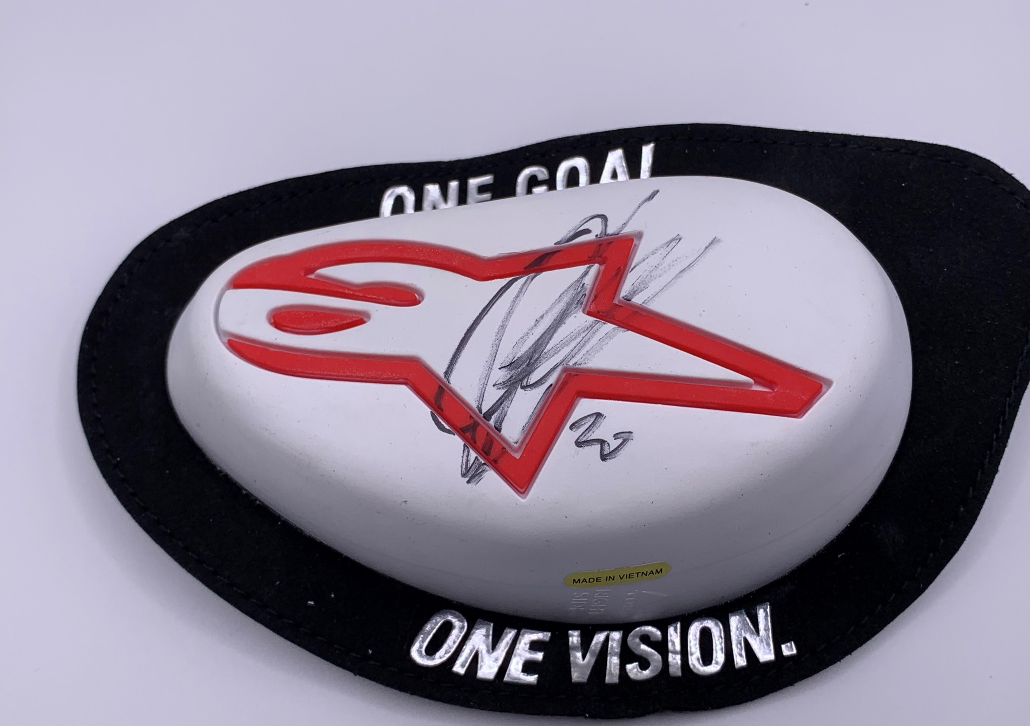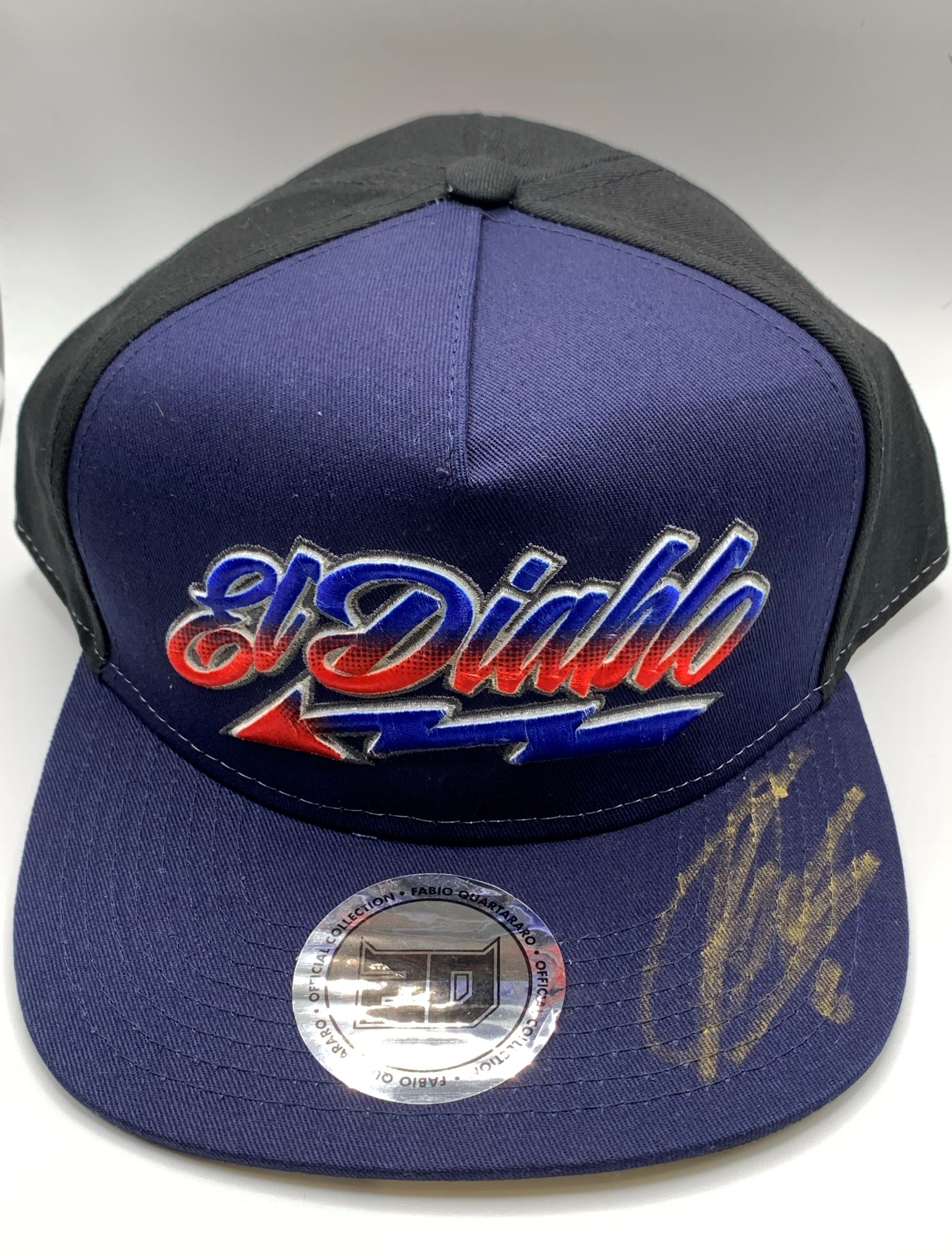 Fabio Quartararo (France) Collection (2021 Moto GP World Champion), includes signed limited edition 2021 Moto GP A3 size art print, signed 2021 official Quartararo ‘El Diablo’ Cap, signed 2020 Action 8 by 12in. photograph and signed Alpine Star knee slider (same brand as wears), with COA and exact photo proof of signing, (4)