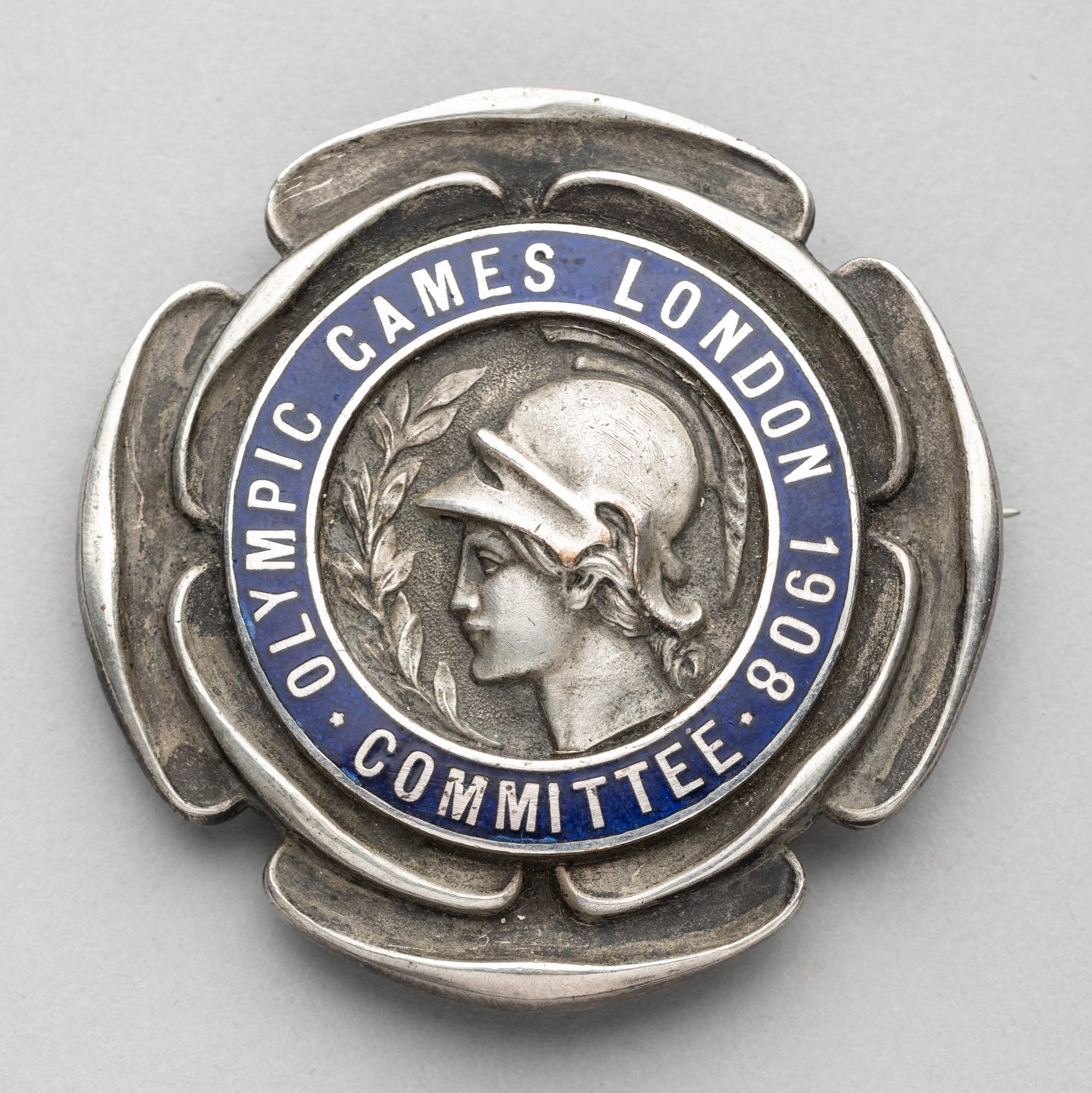 London 1908 Olympic Games Committee member's badge, silvered bronze and blue enamel with central head of Anthea surrounded by OLYMPIC GAMES LONDON 19