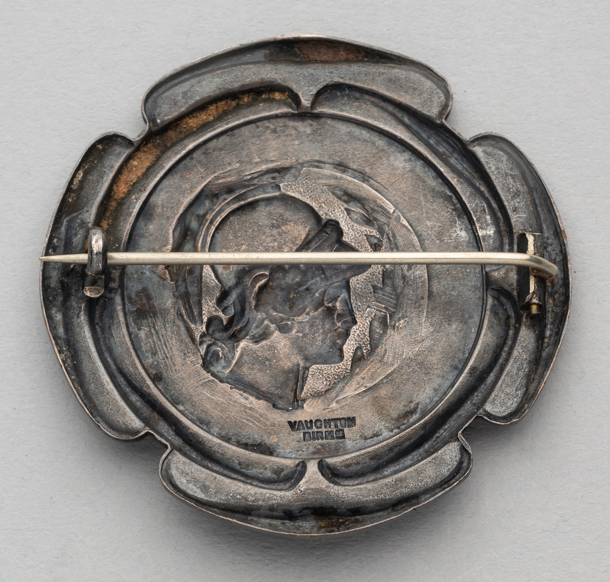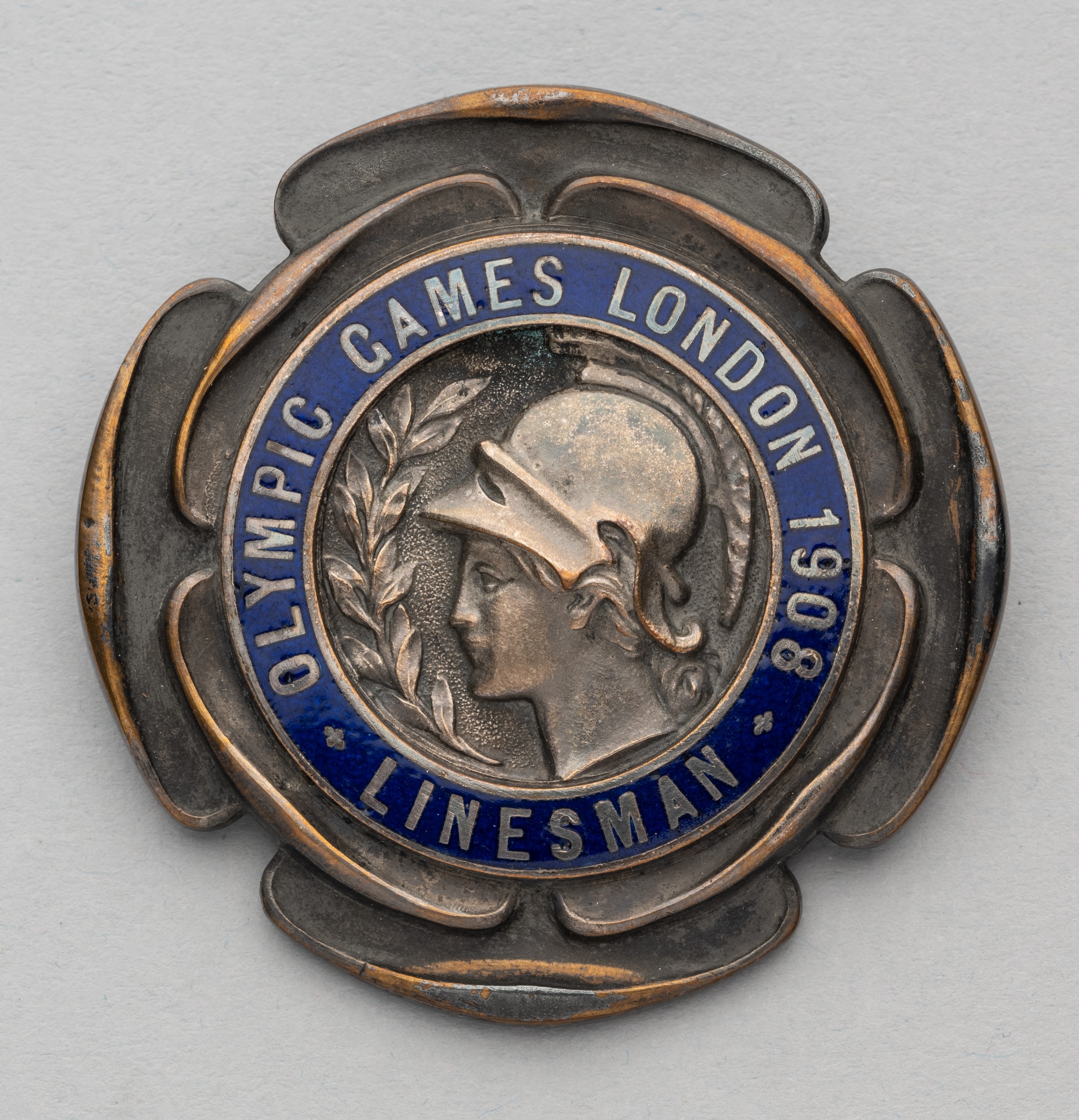 London 1908 Olympic Games Linesman badge, the silvered bronze badge featuring the head of Athena surrounded by OLYMPIC GAMES LONDON 1908 LINESMAN in a blue enamel band, reverse with lapel pin clasp and stamped VAUGHTON BIRM, diameter 57mm., with slight wear to silvered bronze on badge edge and minor enamel loss
