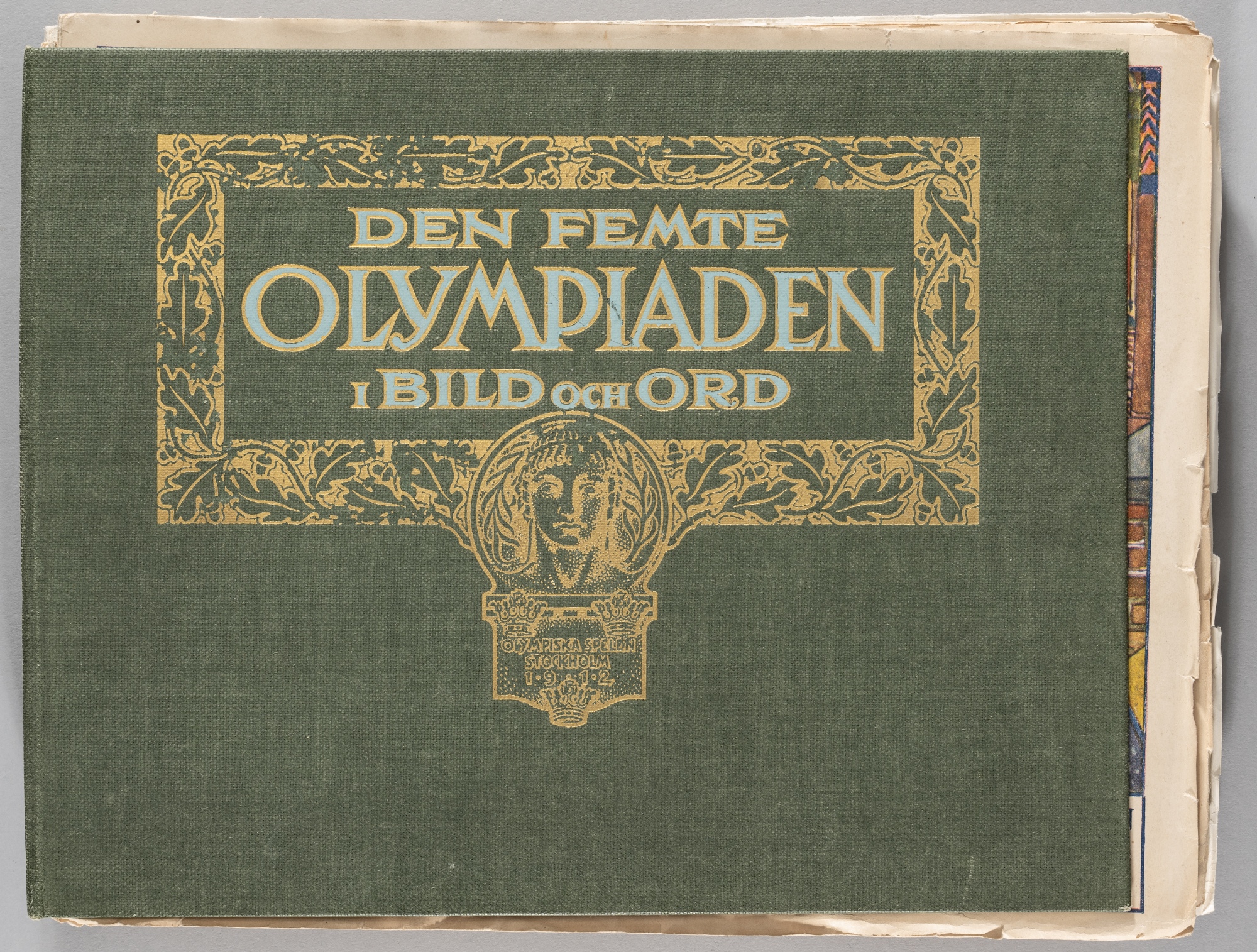 Stockholm 1912 Olympic Games "Den Femte Olympiaden" a set of 24 loose brochures, published by Ahlen & Akerlund Stockholm 1912, green hardcover with gilt tooling and lettering on front cover, complete set of the 24 illustrated brochures of the Olympic Games, no.1 to no.24, Swedish text, brochures not bound to hardback cover, all loose and each with wear, page tears, wear to hardback cover