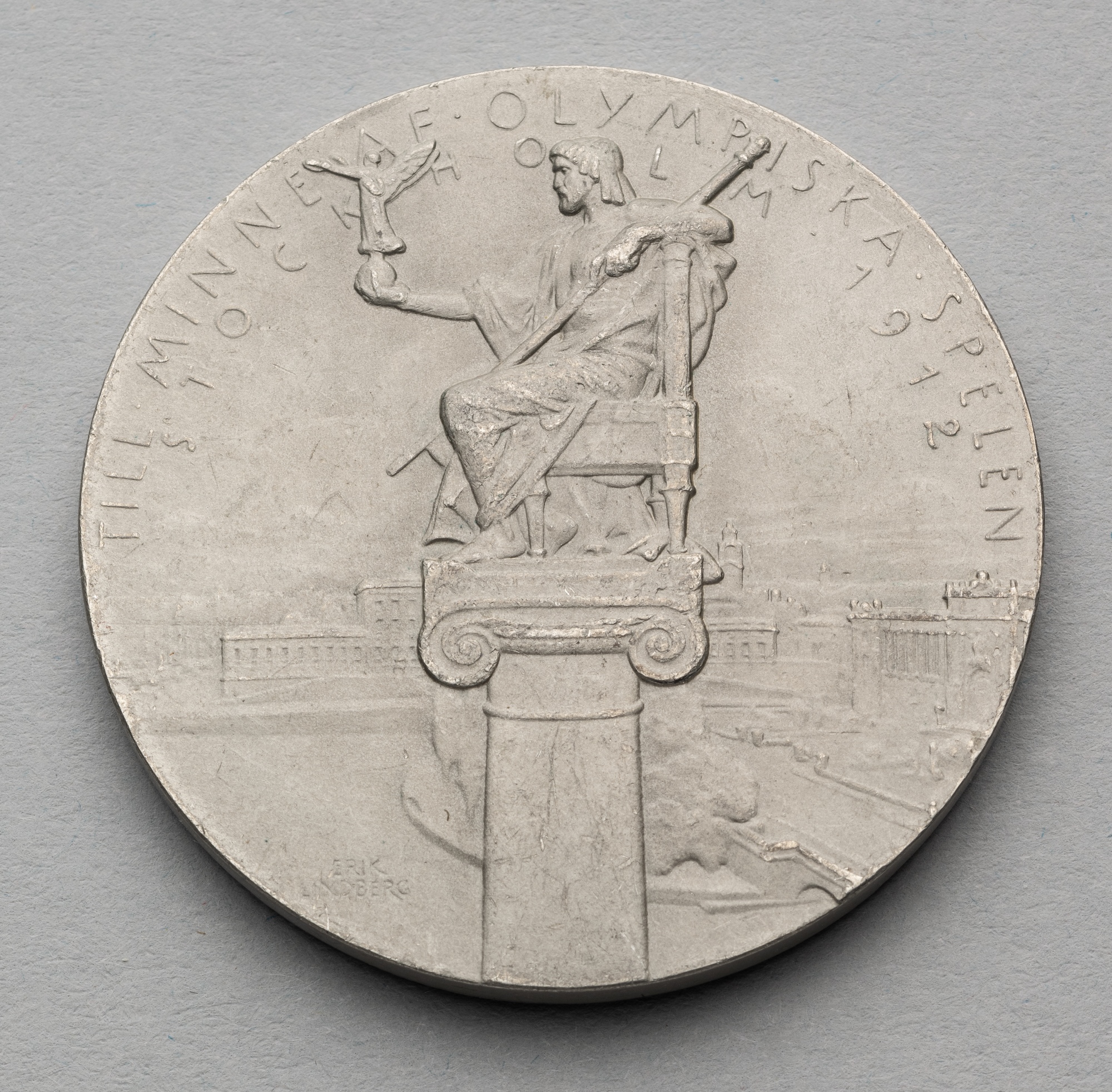 Stockholm 1912 Olympic Games participation medal, designed by Erik Lindberg, white metal, obverse with Zeus seated on an Ionian column holding the fi