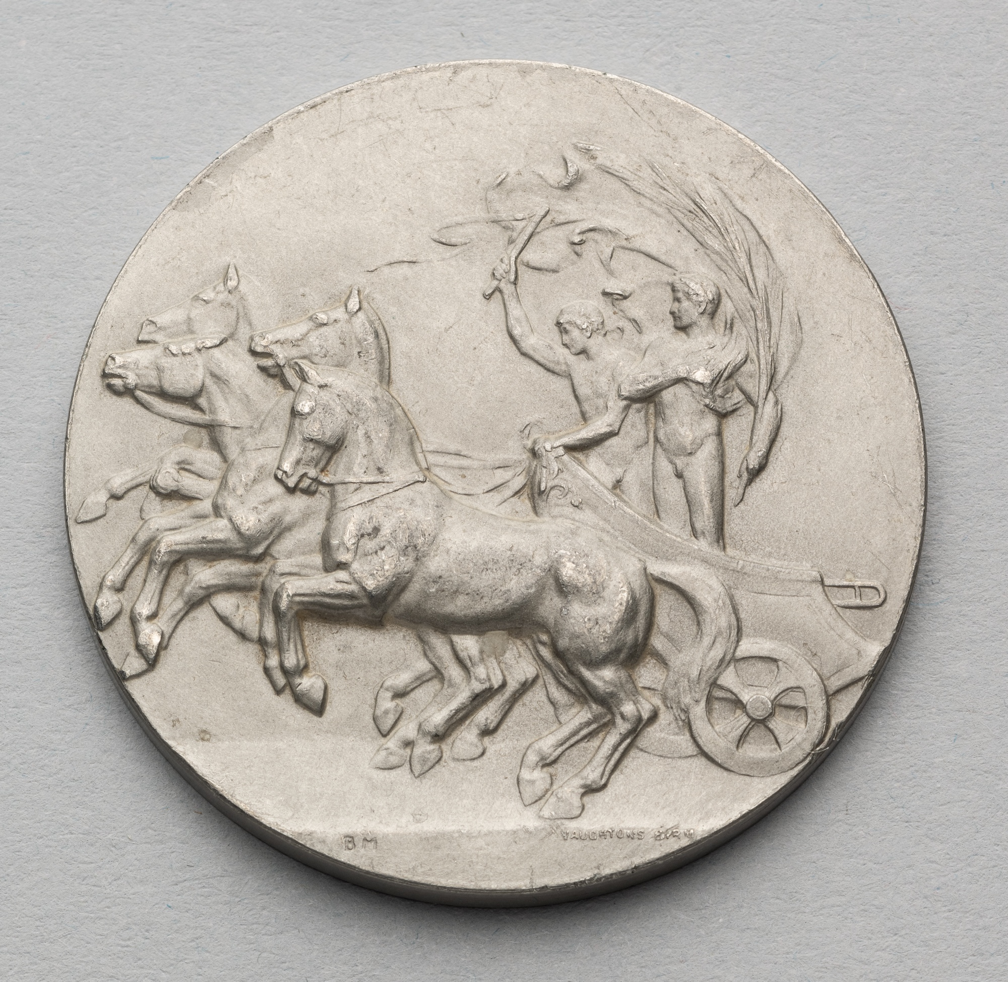 Stockholm 1912 Olympic Games participation medal, designed by Erik Lindberg, white metal, obverse with Zeus seated on an Ionian column holding the figure of Nike and a view of Stockholm beyond, reverse with Bertram MacKennal's 1908 Games deigns of a victorious athlete riding in a quadriga, cast by Vaughton & Sons, Birmingham, diameter 50mm.
