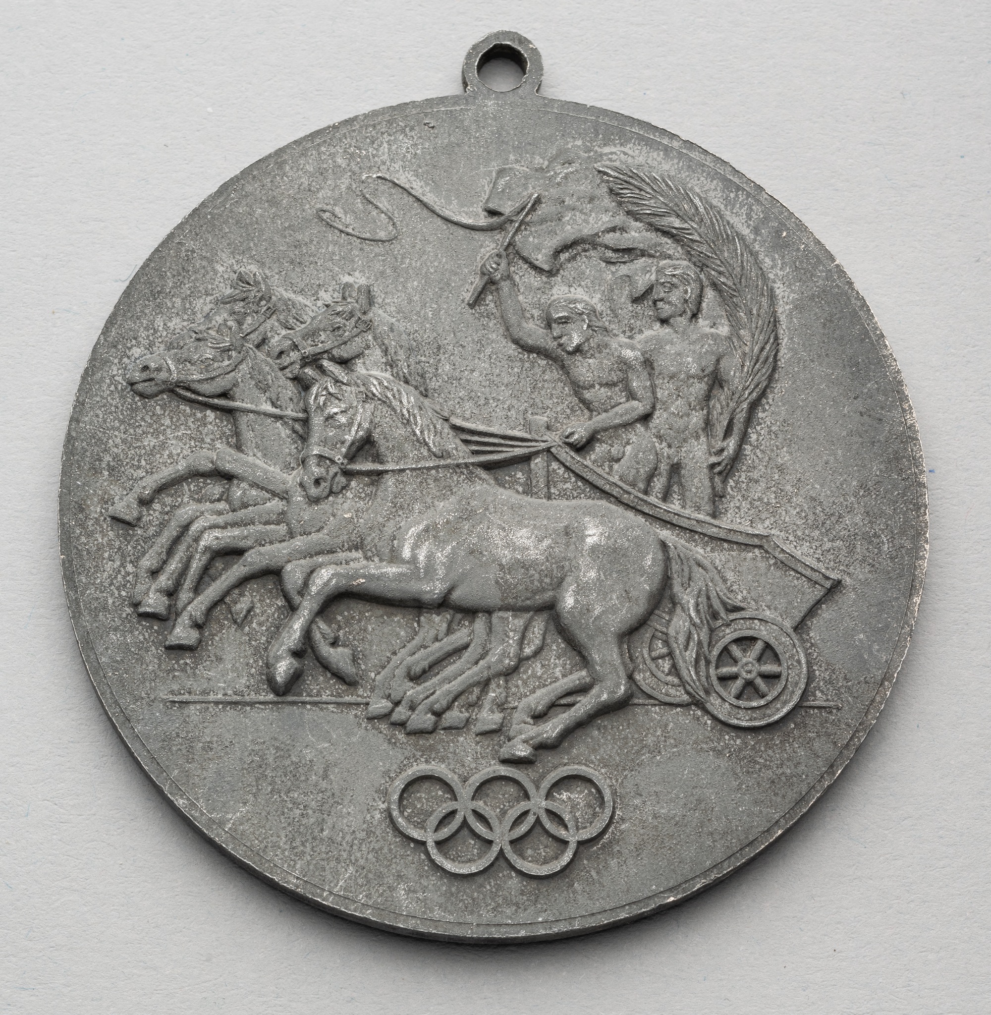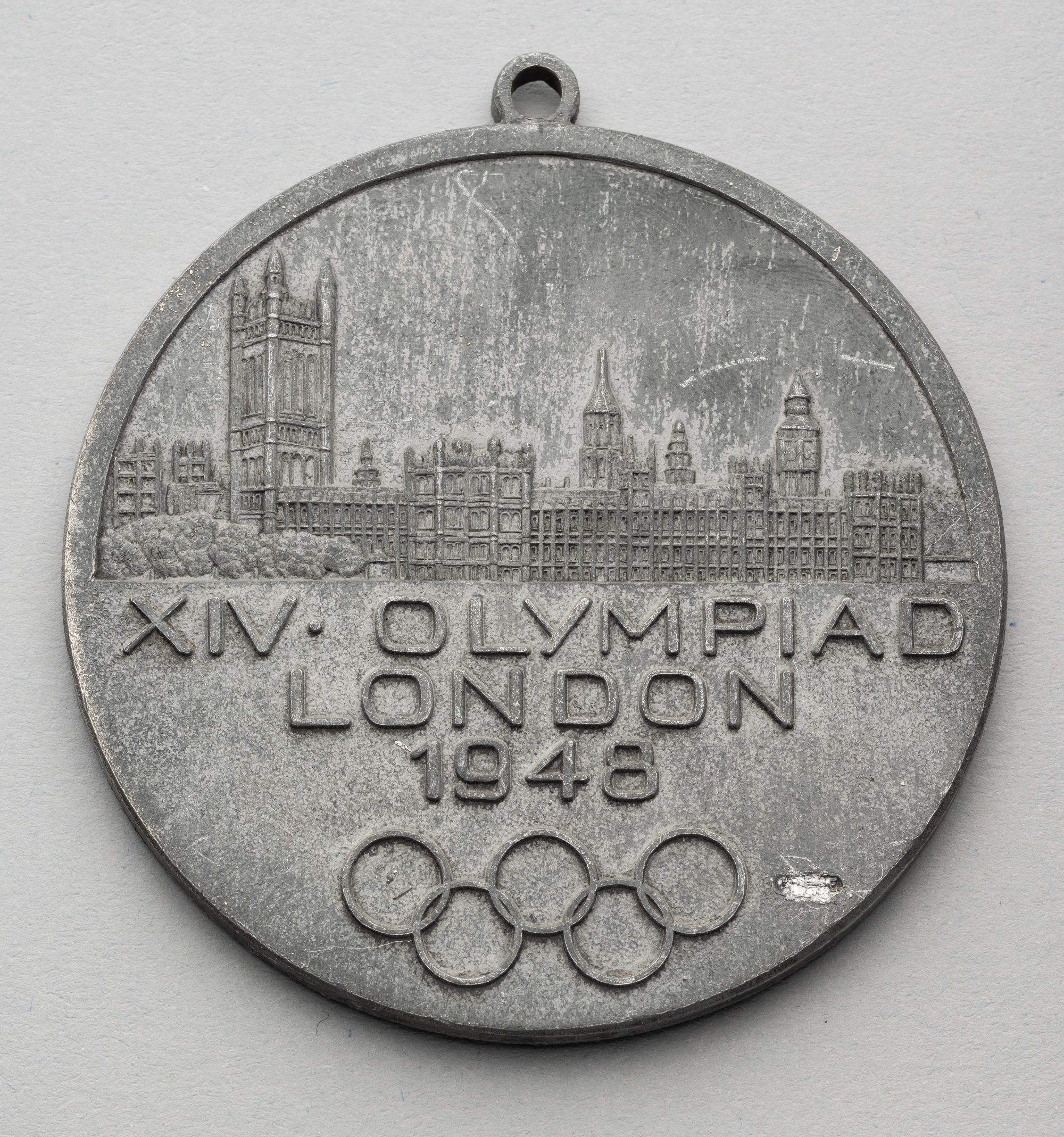 London 1948 Olympic Games large commemorative version of the participation medal with ring suspension, after the design B. Mackennal, struck by John Pinches of London, with view of Westminster and the reverse a victorious charioteer, diameter 80mm. City view of London over legend in three lines, Olympic rings below. City view of London over legend in three lines, Olympic rings below.