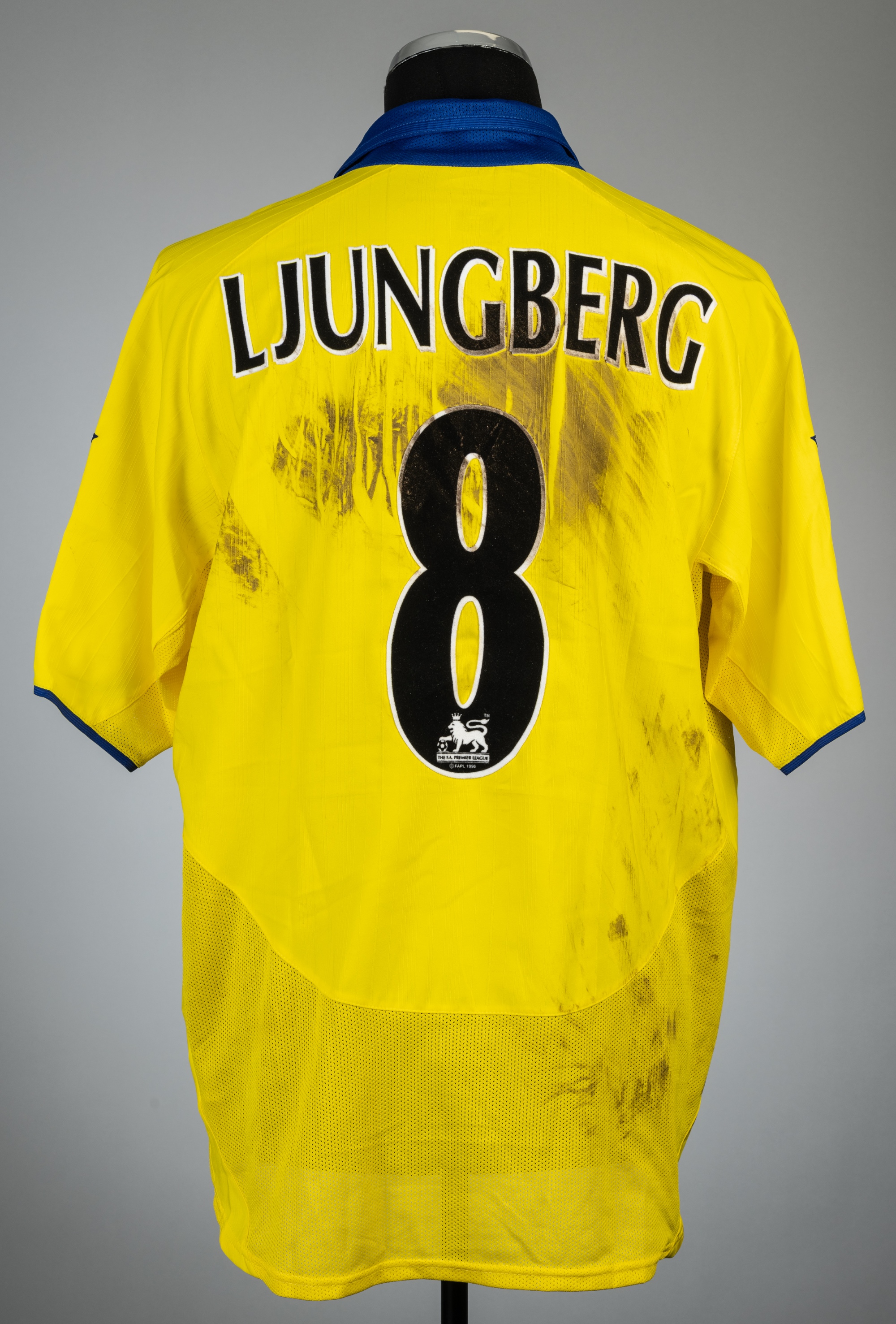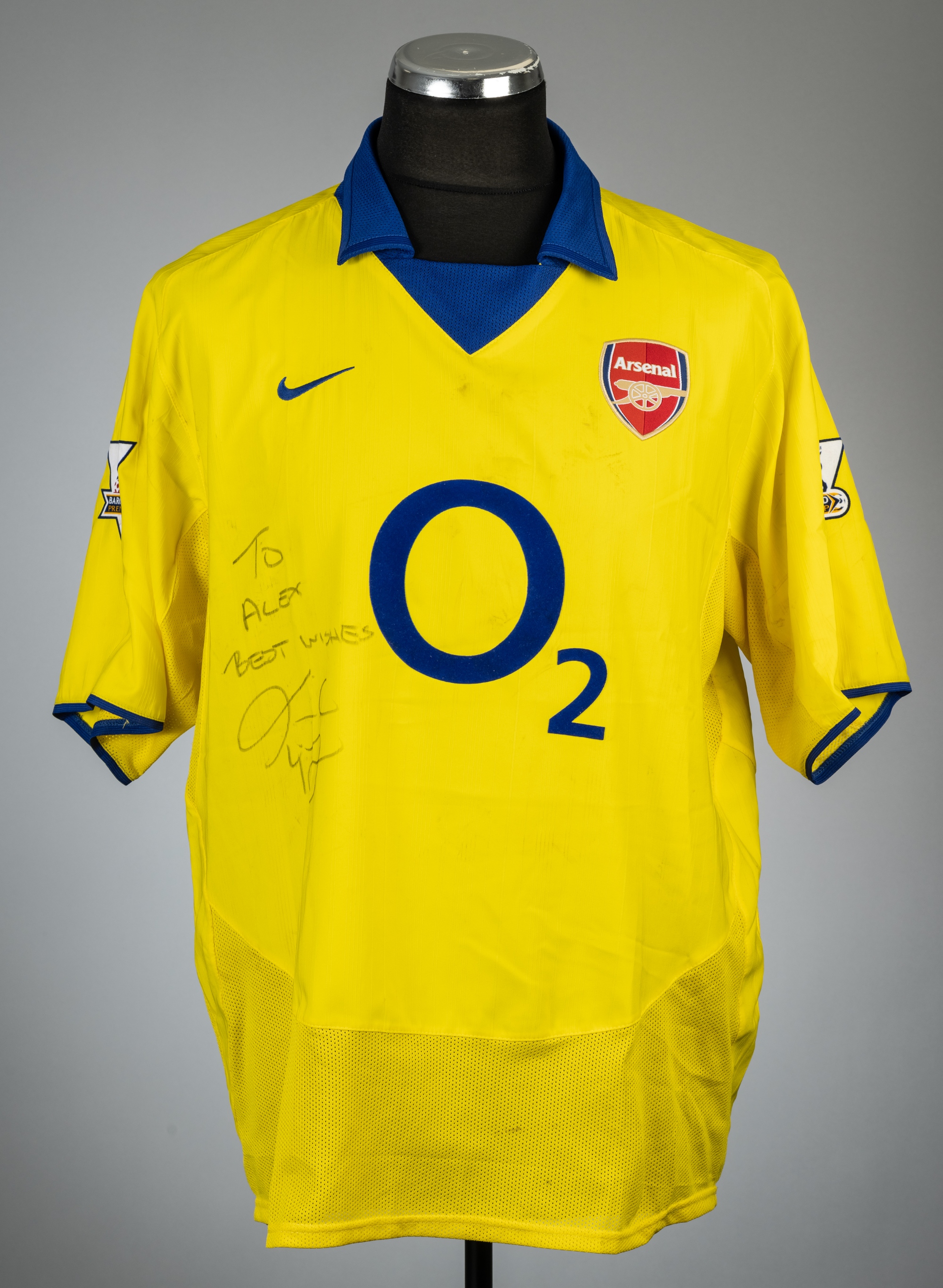 Freddie Ljungberg signed yellow Arsenal no.8 away jersey, season 2003-04, Nike, short-sleeved with BARCLAYCARD PREMIERSHIP sleeve badges, club crest and sponsor logo, reverse lettered LJUNGBERG, signed and dedicated "To Alex best wishes" in black marker pen to front, size L, bears pitch marks stains to front, reverse and sleeves