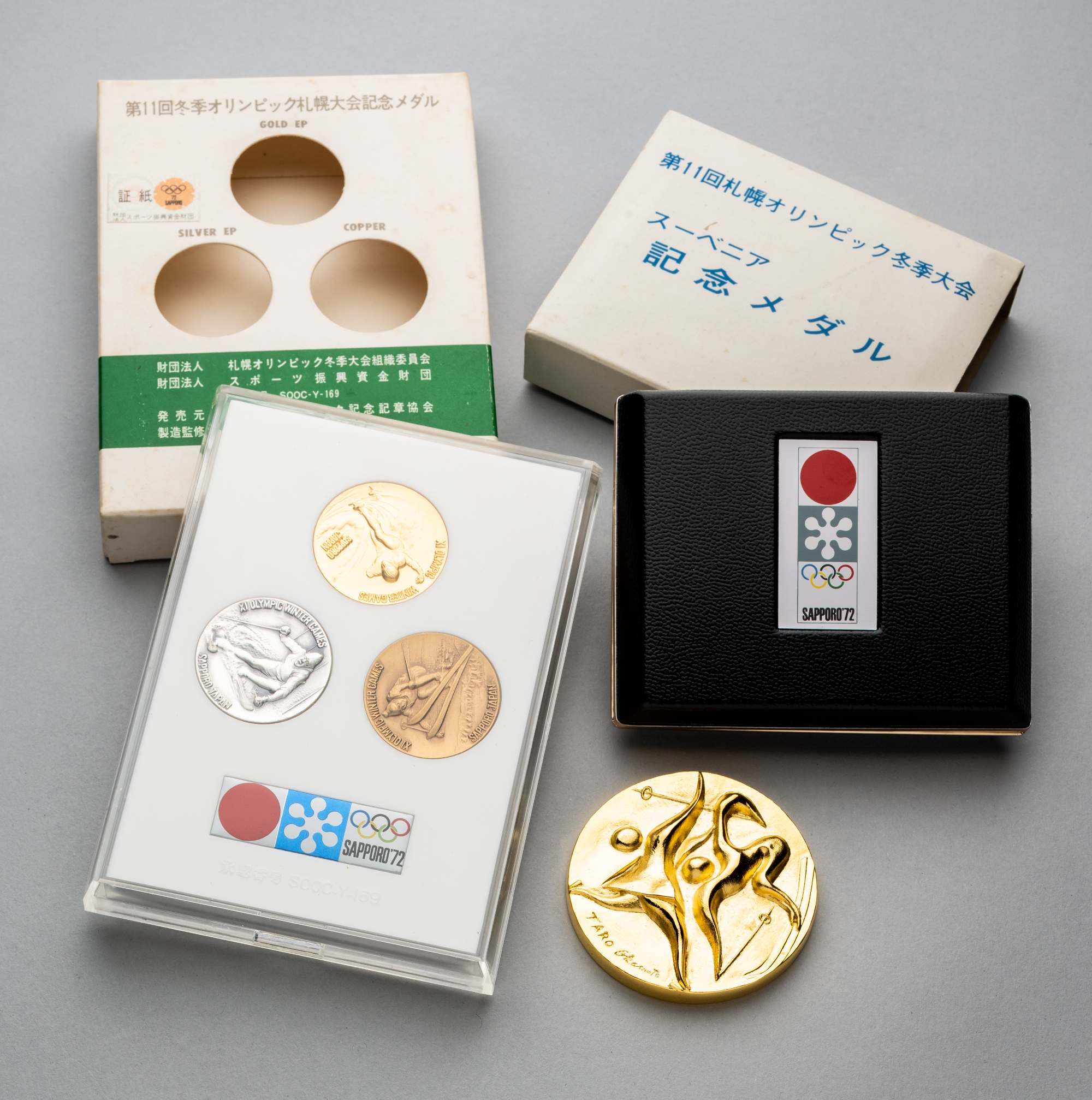 Sapporo 1972 Winter Olympic Games souvenir medal, designed by Taro Okamoto (Japanese, 1911), issued by the Japanese Skiing Association, zinc alloy plated in pure gold, diameter 59mm., in original fitted case, bearing JOC '71-A-0144 on inner case lid, with outer paper cover with text in Japanese; sold together with cased set of three commemorative medal from the Sapporo 1972 Olympic Games, each electroplated in either gold, silver or copper and featuring a speed skater, a slalom skiier and a downhill skiier, in fitted case with out paper cover with text in Japanese, (2)