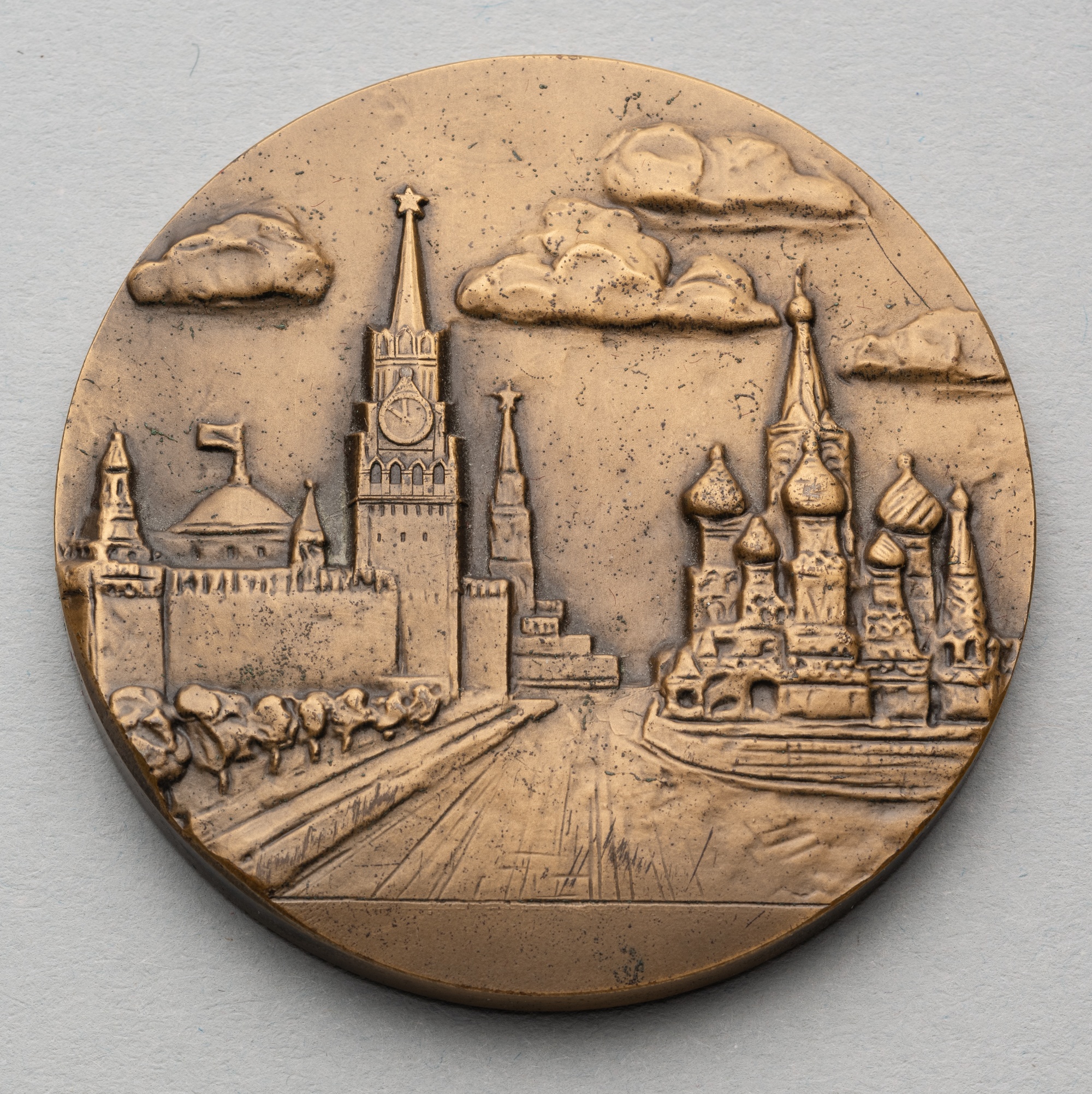 Moscow 1980 Olympic Games participant's medal, bronze, 60mm., by A. Leonova, Moscow Olympic emblem over Olympic stadium, the reverse with a view of Red Square in Moscow, in case