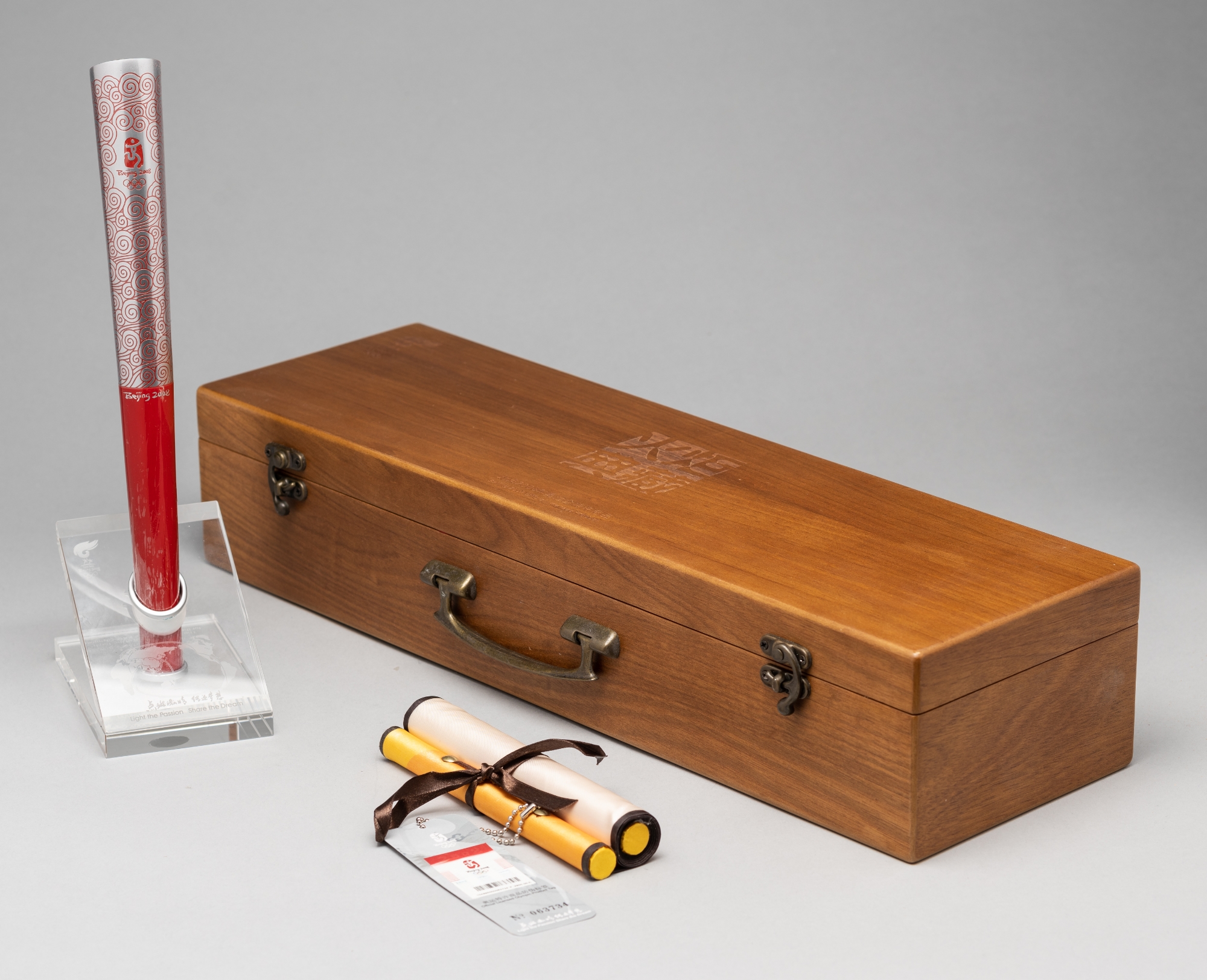 Beijing Olympic Games 2008 "Bird's Nest" bearer's torch miniature scale model, designed by the Lenevo Group Beijing, steel, the curved form with red etched and anodized "Luck Cloud" decoration, the rubberised handle representing a paper scroll, in a sealed plastic cover, 29cm., with etched glass stand 8 by 8 by 12cm., with collection certificate scroll in Chinese and English text, with authentication label, limited edition of 200,000, in a fitted wooden case with inscribed hinged lid