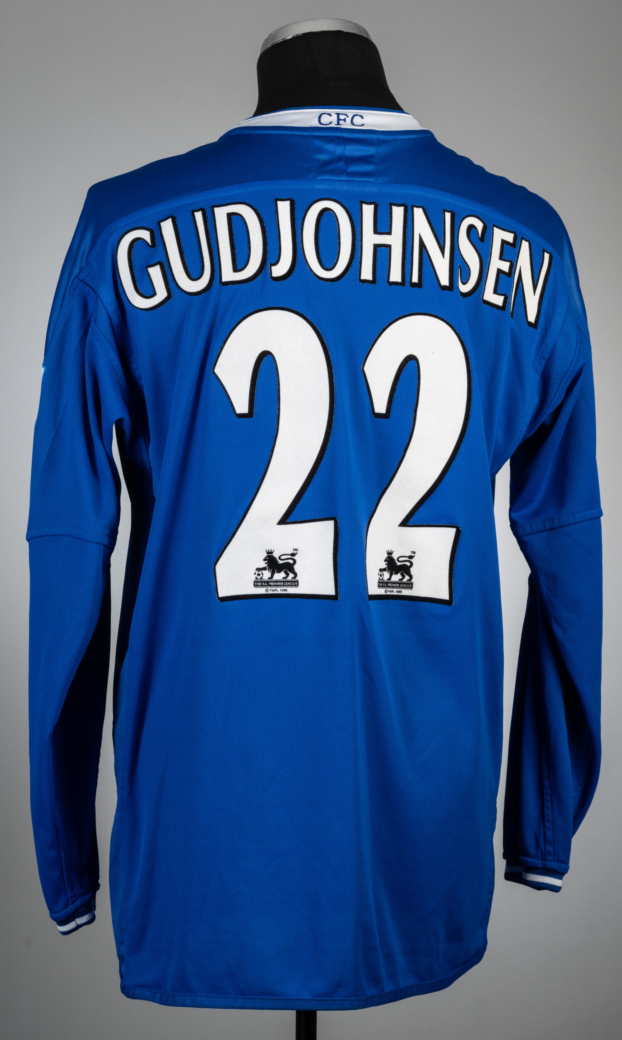 Eiour Gudjohnsen blue Chelsea no.22 home jersey, season 2003-04, Umbro, player issued long-sleeved with BARCLAYS PREMIERSHIP sleeve badges, embroidered club crest and sponsor logo, CFC embroidered on reverse of white collar, reverse lettered GUDJOHNSEN, size L 43in.