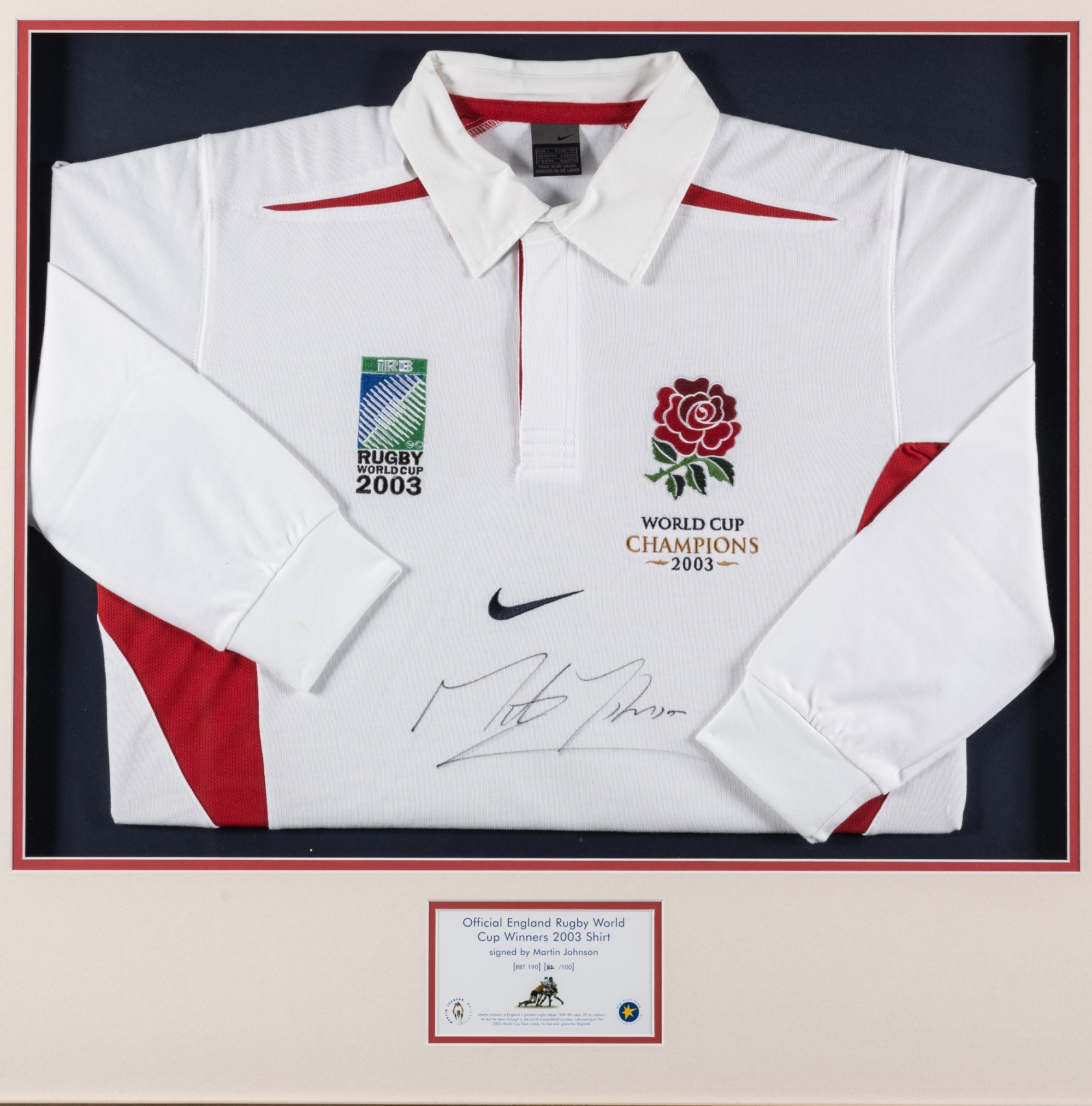 Martin Johnson signed England World Cup Champions 2003 jersey display, white Nike jersey with embroidered England rose emblem, WORLD CUP CHAMPIONS 2003 and IRB RUGBY WORLD CUP 2003 logo, signed in black marker pen, mounted above Big Blue Tube limited edition COA 82 of 100, glazed and framed, overall 84 by 89cm. All glass will be removed from framed and glazed items prior to posting and may result in delays to shipping your items. (This service is included in the cost of postage and packing). We can also totally remove all framing and mounts upon request to reduce shipping costs. Alternatively lots can be collected in person by prior appointment from NN8 1RT.