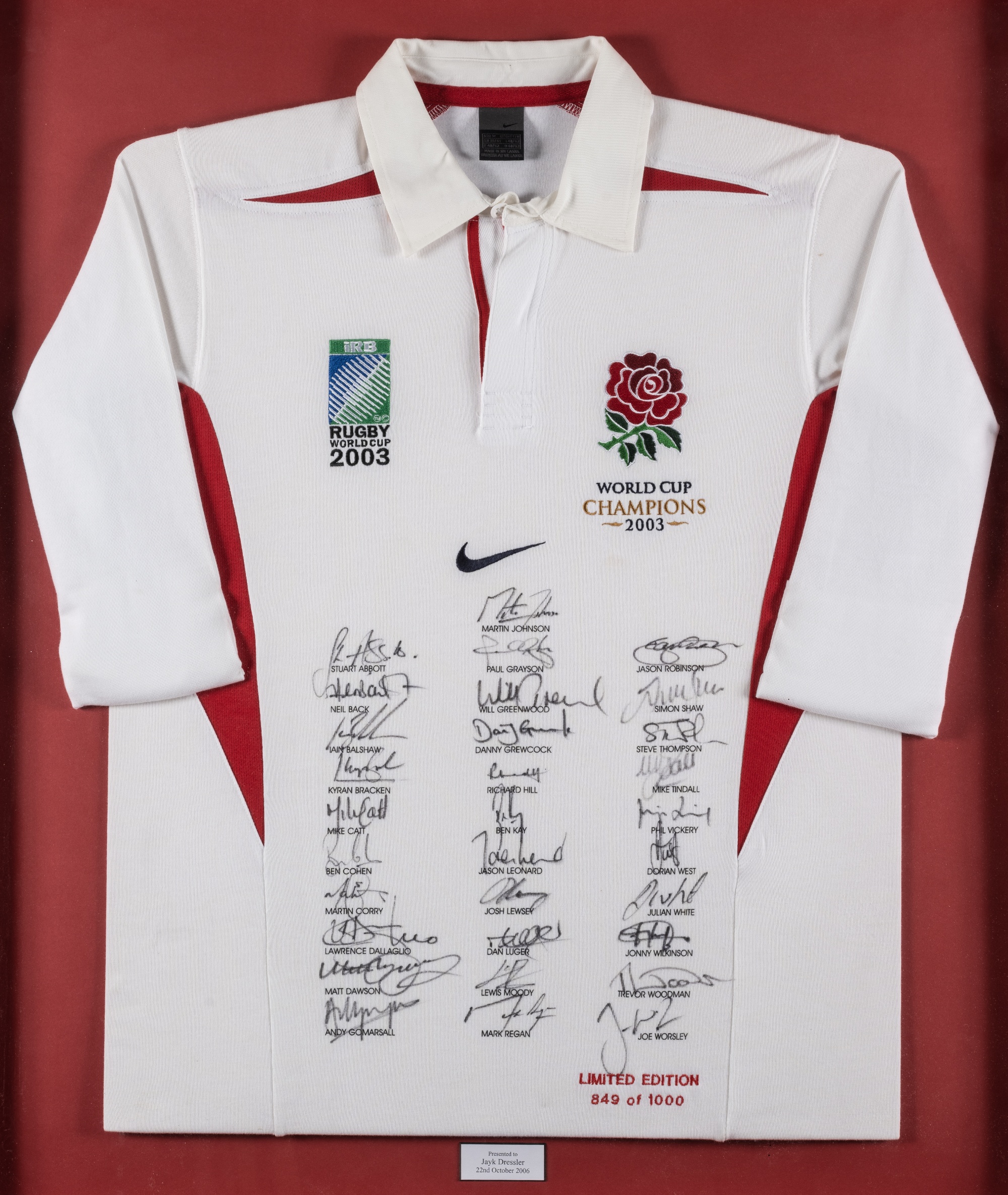 England Rugby World Cup Champions 2003 squad signed limited edition jersey, Nike, long-sleeved with England rose emblem, embroidered with WORLD CUP CHAMPIONS 2003 and RUGBY WORLD CUP 2003, signed by 31 squad members above their individually printed names, limited edition 849 of 1000, size 39/41, mounted, glazed and framed, 92 by 80cm overall All glass will be removed from framed and glazed items prior to posting and may result in delays to shipping your items. (This service is included in the cost of postage and packing). We can also totally remove all framing and mounts upon request to reduce shipping costs. Alternatively lots can be collected in person by prior appointment from NN8 1RT.