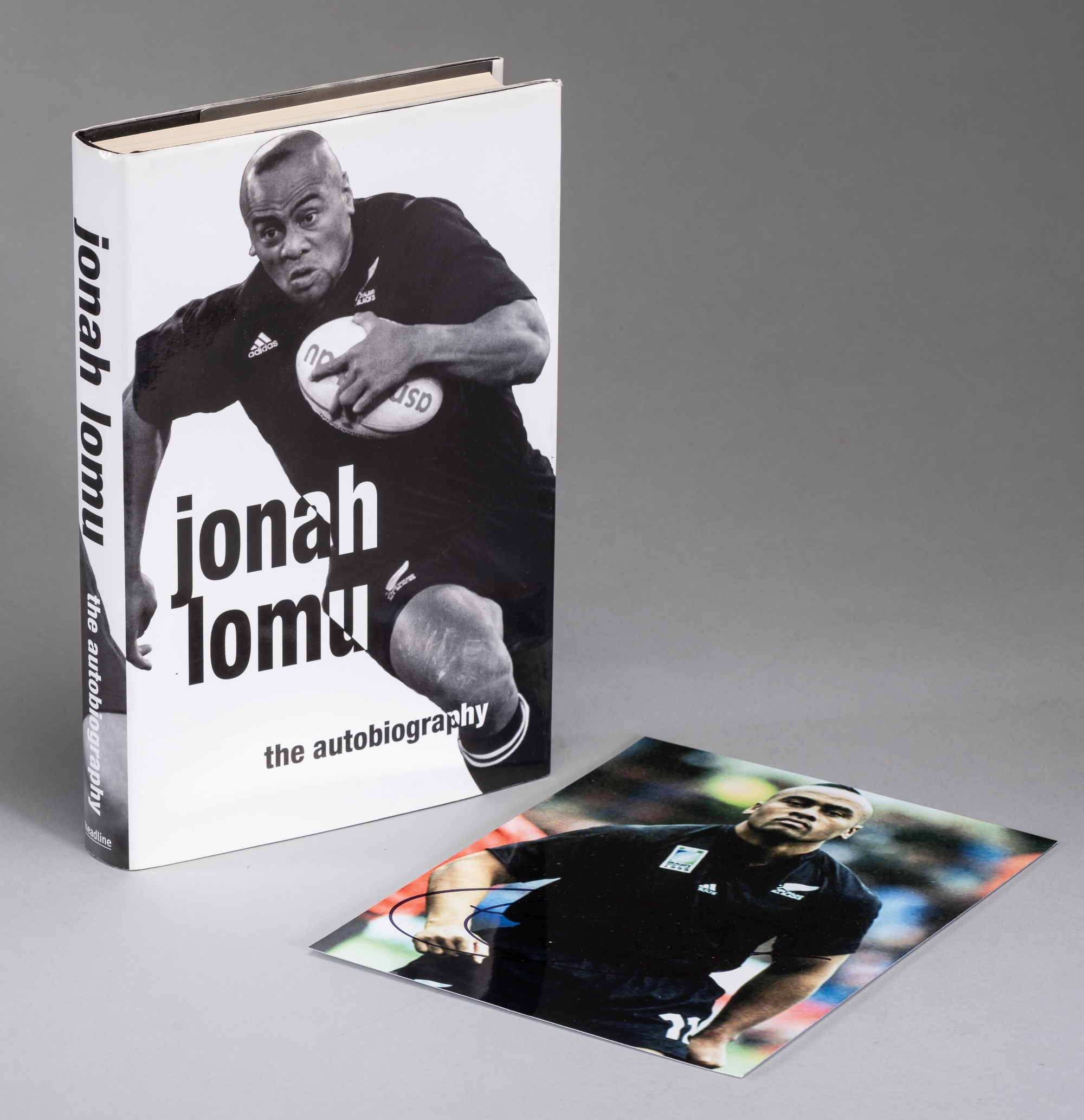 Jonah Lomu signed "The Autobiography", hardback with d/j, signed in black marker pen on inside page and a signed 8 by 6in. colour photograph, signed in black marker pen, (2)