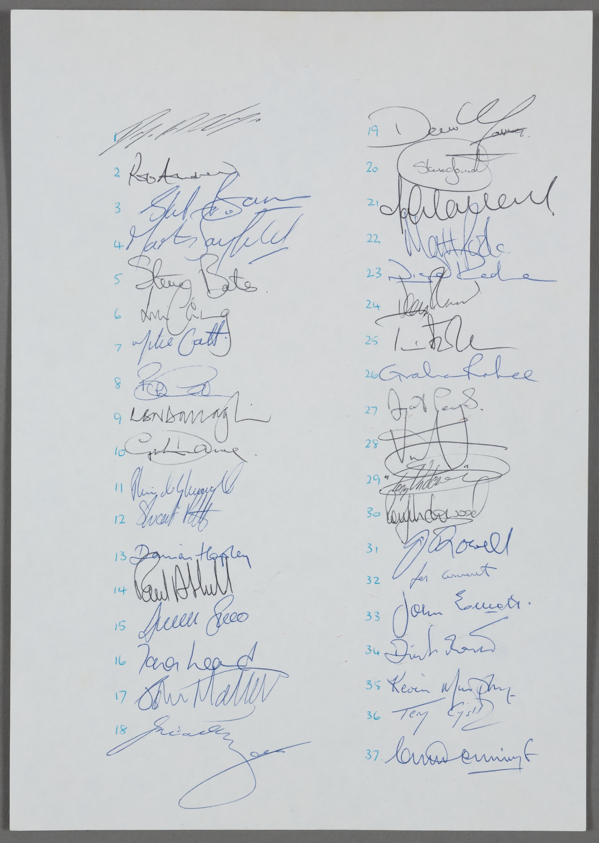 ENGLAND TO SOUTH AFRICA 1994 RUGBY UNION OFFICIAL AUTOGRAPH TEAM SHEET In 1994 Nelson Mandela had just been elected as President of South Africa, and the England team were due to meet him at the first test match played at Loftus Versfeld, Pretoria, 4th June, 1994. England won the match by 32 points to 15. OFFICIAL RUGBY UNION CERTIFICATE OF THANKS / AUTOGRAPH SHEET, WITH PRINTED HEADING, ENGLAND RED ROSE AND MESSAGE TO ONE SIDE WITH THE AUTOGRAPHS OF TOUR MANAGER JACK ROWELL AND CAPTAIN WILL CARLING BELOW. FULLY SIGNED TO THE BLANK VERSO IN DIFFERENT COLOURED INKS ADJACENT TO THE SQUAD NUMBER BY THE COMPLETE ENGLAND SQUAD AND MANAGEMENT FOR THE 1994 TOUR TO SOUTH AFRICA, 39 ORIGINAL INK AUTOGRAPHS INCLUDING: WILL CARLING (Capt), PAUL HULL, TONY UNDERWOOD, PHIL DE GLANVILLE, RORY UNDERWOOD, ROB ANDREW, DEWI MORRIS, JASON LEONARD, BRIAN MOORE, MARTIN BAYFIELD, TIM RODBER, BEN CLARKE, DEAN RICHARDS, MIKE CATT, GRAHAM DAWE, GRAHAM ROWNTREE et al. EXCELLENT CONDITION.