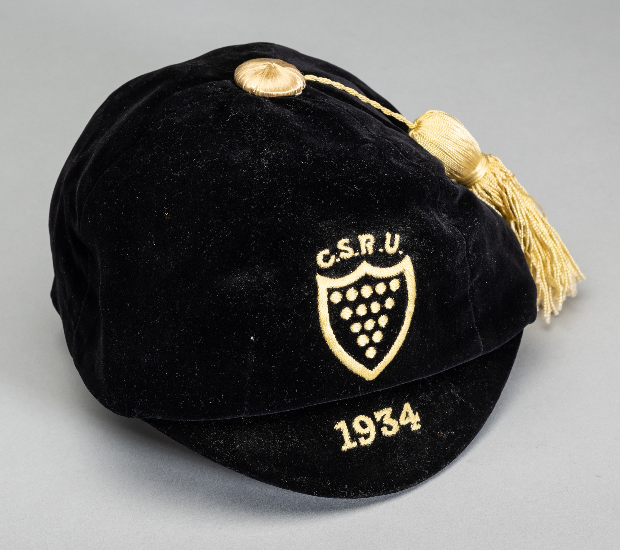 Cornwall Schools' rugby representative cap 1934, black velvet cap with yellow tassel, embroidered with C.S.R.U. crest and 1934, bears name label on interior with W. BONHAM in black ink, size 7, bears Anthemion Auctions Lot 750 tag