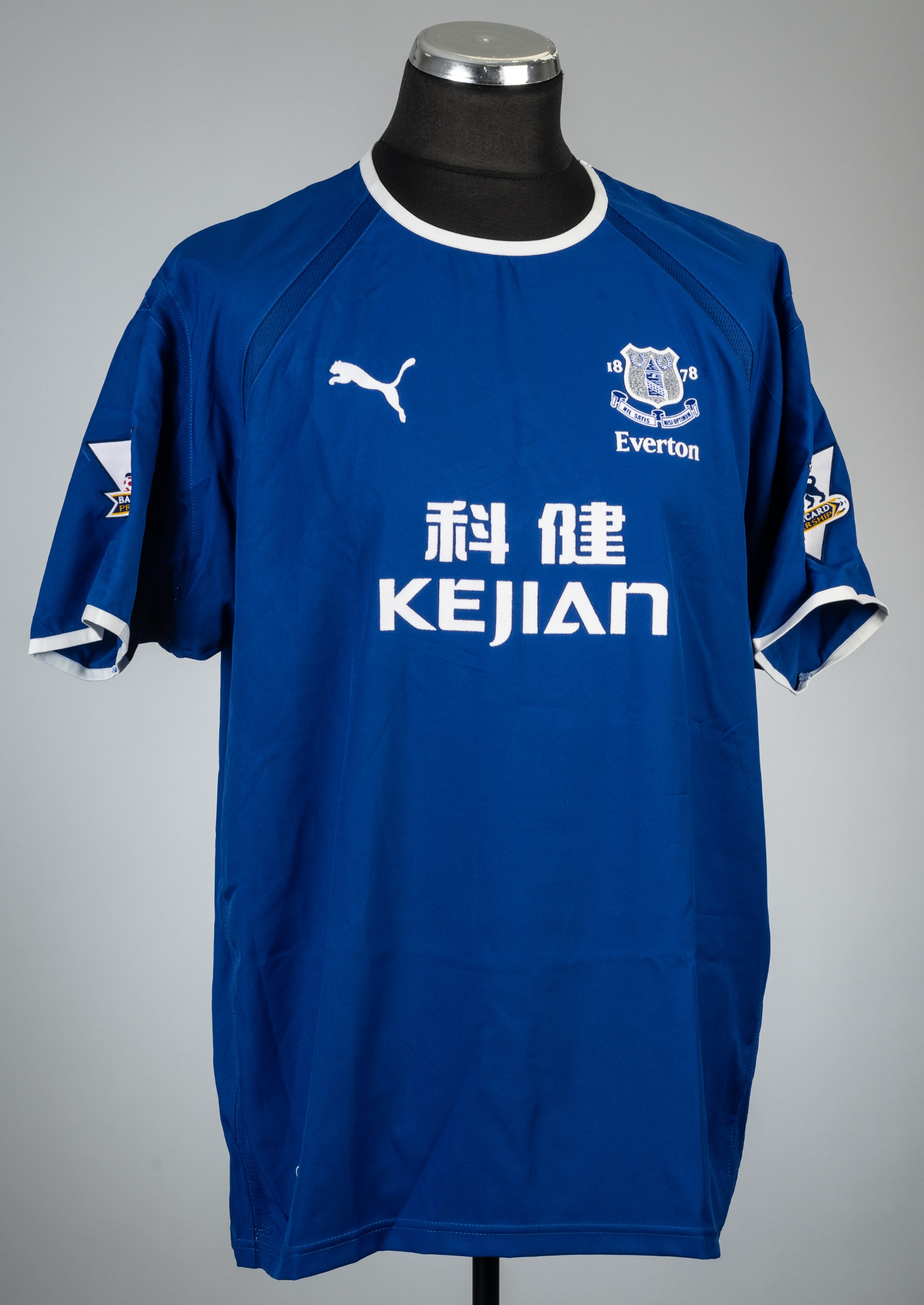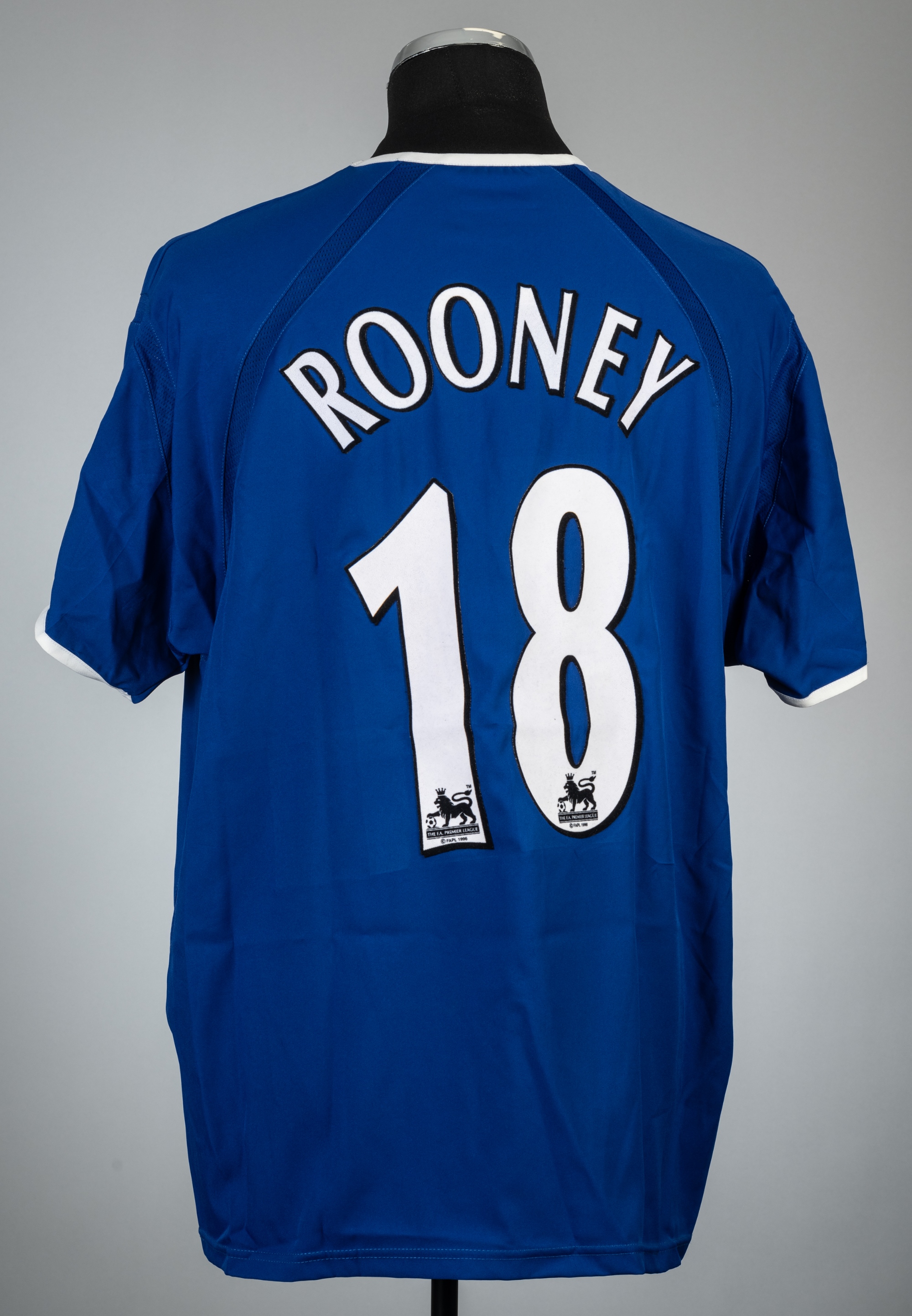 Wayne Rooney blue Everton no.18 125th anniversary home jersey, season 2003-04, Puma, short-sleeved with BARCLAYCARD PREMIERSHIP sleeve badges, club crest with 125 anniversary 1878-2003 badge, and sponsor logo, reverse lettered ROONEY, size XL Provenance: given to Tottenham Hotspur kitman possibly after fixture at White Hart Lane on 4th October 2003, when Rooney came on as a substitute in the 55th minute.