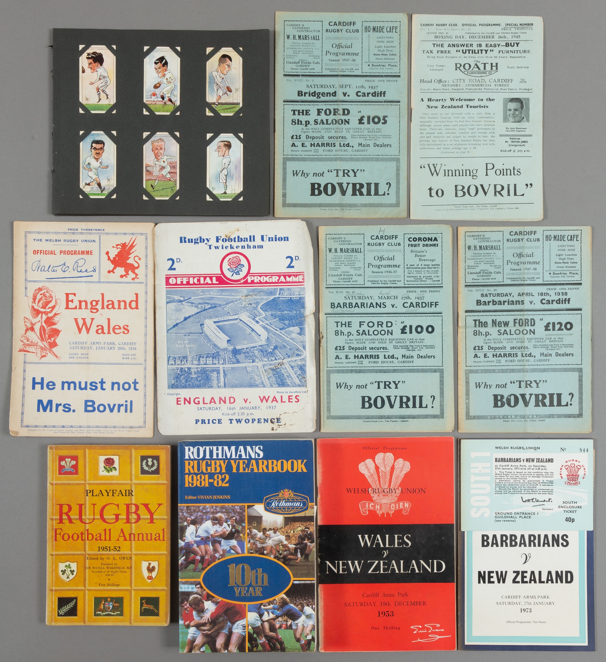 Collection of rugby ephemera, including approximately 115 programmes dating between 1930s and 1980s, including some international matches notably Wales v New Zealand 1953 (Wales last victory over the All Blacks), Barbarians v New Zealand 1973 (Gareth Edwards famous try), the content mostly relating to Cardiff, Wales and the Barbarians; the lot also including 18 volumes of Playfair rugby football annual, between 1949-50 and 1972-73 and an unbroken run of 12 Rothmans rugby year books 1973-74 to 1984-85; content also including a complete set of 50 Wills cigarette cards of rugby internationals circa 1930; and a few other books and annuals, (qty)