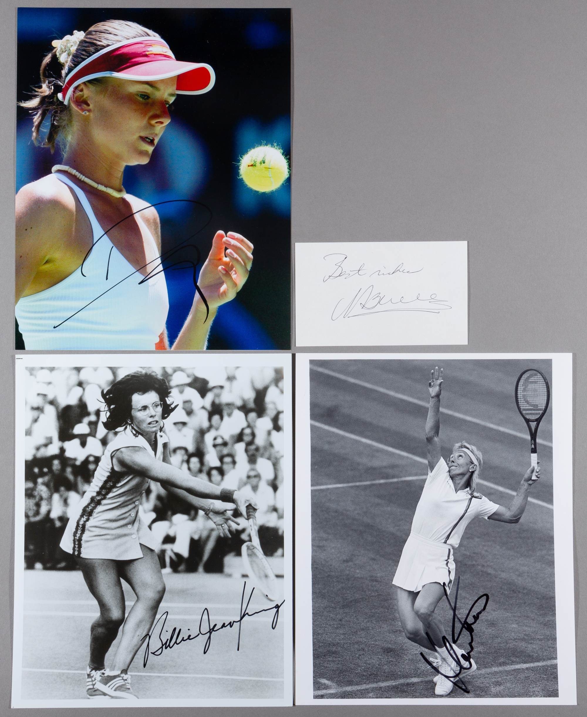 Signed photographs of female tennis stars and legends, including J Heron, BJ King, C Martinez (2), J Capriati, V Duchevina, M Sharapova (2), S Graf (2), A Mauresmo, N Petrova, K Clijsters, M Navratilova (2), V Wade, A Jones, card of Maria Bueno, approximately 22