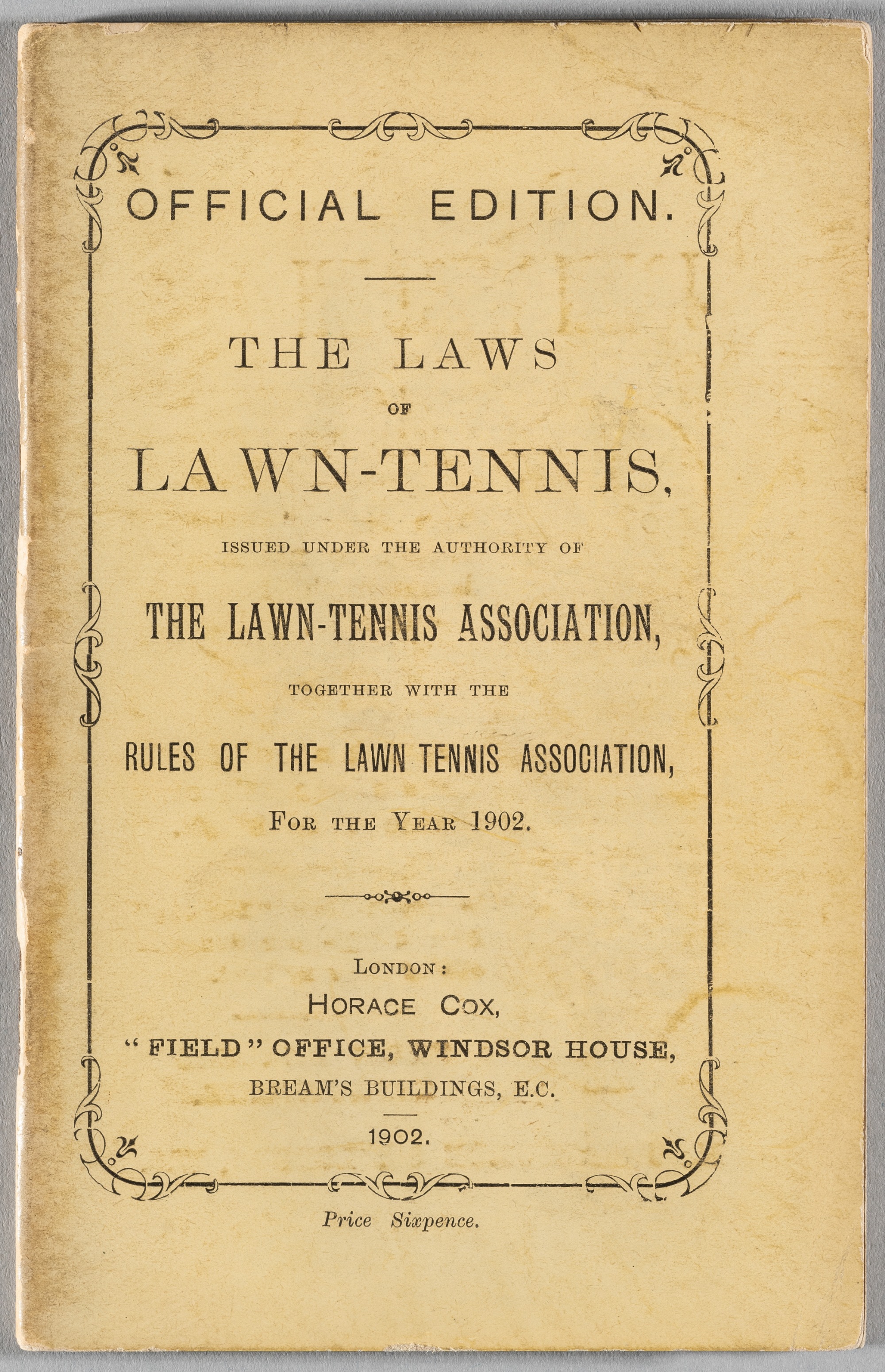 The Laws of Lawn Tennis, issued under the authority of the Lawn Tennis Association, 1902, by Horace Cox of “The Field”, London, over 45 pages of law