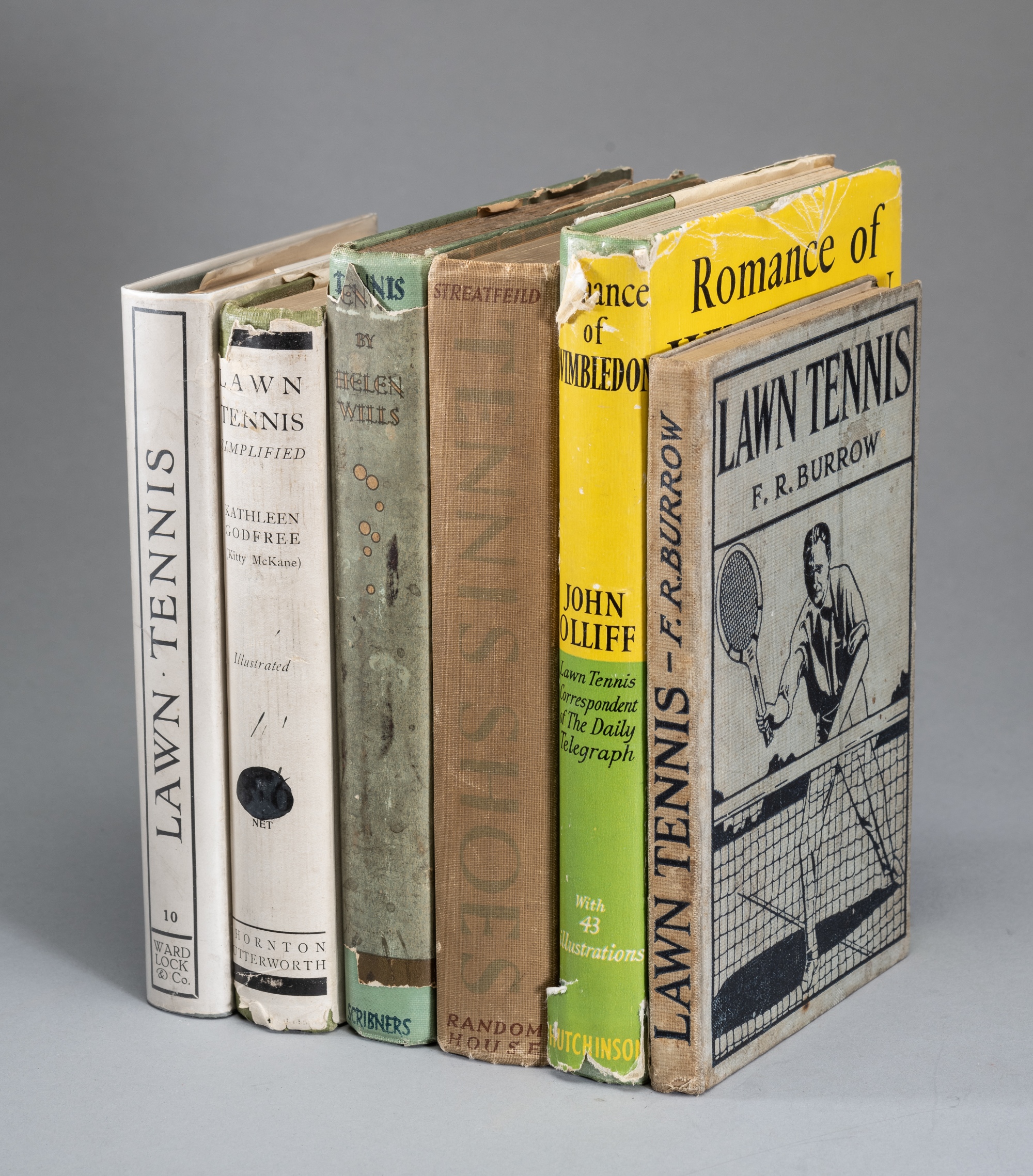 Collection of 1920s tennis related books, comprising Lawn Tennis Simplified by Godfree, Kathleen, hardback with d/j, Thornton Butterworth Limited, 1929; The Lawn Tennis Masters Unveiled by Hart, B.H Liddell, hardback, Arrowsmith, 1926; Tennis, by Wills, Helen, hardback with d/j, Charles Scribner's Sons, 1929; Lawn Tennis a method of acquiring proficiency by Rendall, Major JCS, blue hardback, Cassell & Company Ltd., 1926; Forty Years of First Class Lawn Tennis by Hillyard, GW, hardback, Williams & Norgate Ltd., 1925; The Art of Lawn Tennis by Tilden, William T., Methuen & Co. Ltd, green hardback, 1921; Tennis Shoes by Streatfrild, Noel, Random House, hardback; Lawn Tennis the game of nations by Lenglen, Suzanne, hardback, George G Harrap & Company Ltd, 1925, (2); First Steps to Lawn Tennis by Beamish, A.E., hardback, Mills & Boon Limited, 1922; Listening to Lacoste by Pollock, John, hardback, Mills & Boon Limited, 1926; Lawn Tennis by Hierons, Charles, hardback with d/j, Ward, Lock & Co. Limited, revised and enlarged edition; Lawn Tennis Up-to-Date by Blackmore, S. Powell, hardback with d/j, Methuen & Co. Ltd., 1921; The Lawn Tennis Tip Book by Beamish A.E., hardback, Mills & Boon Limited, 1923; Lawn Tennis by Burrow F.R., green hardback, Hodder & Stoughton; Lawn Tennis of to-day by Burrow, F.R., hardback, C. Arthur Pearson Ltd., 1924, (2); The All England Series Lawn Tennis by Wilberforge, HWW., canvas cover, G. Bell & Sons Ltd, 1920; Lawn tennis by Fry, Joan and Doust, SN., green hardback, W. Foulsham & Co. Ltd; Fifty Years of Lawn Tennis by Oyler TH., hardback, South Eastern Gazette, 1925; Fifty Years of Wimbledon by Myers, A. Wallis, hardback, Hudson & Kearns Ltd; Romance of Wimbledon by Olliff, John, hardback with d/j, Hutchinson & Co.; Lacoste Tennis by Lacoste Rene, hardback, Dunlop Sports Company, 1928; Gordon Lowe on Lawn tennis by Lowe, Gordon, greenish hardback, Hutchinson & Co.; Modern Lawn Tennis by Alvarex, Lili de., red hardback, John Lane The Bodley, 1927; Lawn Tennis by Crawley, AE., hardback with d/j, Metheun & Co. Ltd., 1921; Learning Lawn Tennis by Nutthall, Betty, blue hardback, Herbert Jenkins Limited, 1928; Lawn Tennis for Public Courts Players, by Aitken AJ, green hardback, Methuen & Co Ltd, 1924; Lawn Tennis fr young palyers, by Tilden, William T., green hardback, Methuen & Co Ltd, 1924; Daily News Cricket & Tennis annual 1923, (poor conditon with cellotape on cover); Tennis Tactics by Little, Raymond D, green hardback, Macmillan Company, 1923; (qty)