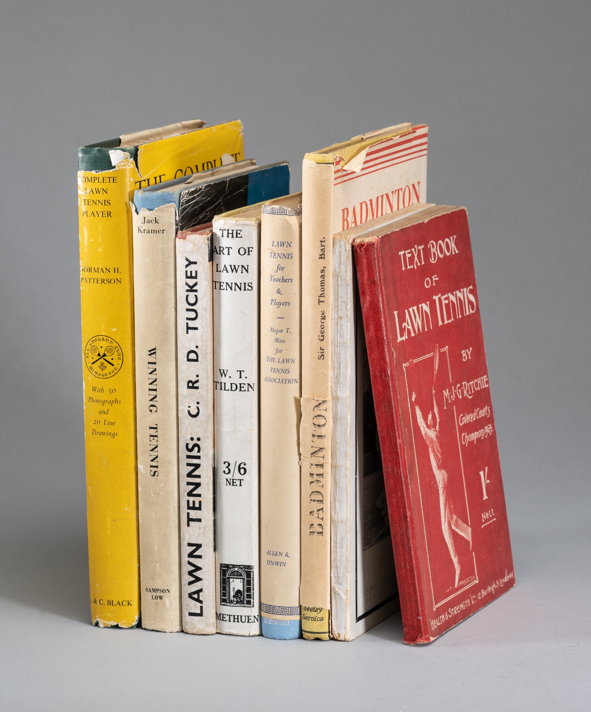 Collection of 1930s and 1940s Tennis, Squash and Badminton books, comprising Lawn Tennis it's principles & practicce by Myers, A. Wallis., hardback with d/j, Seeley, Service & Co. Ltd., 1930;Beyond the game by Jacobs, Helen Hull, red hardback, Sampson Low, Marston & Co., Ltd.; Badminton by Thomas, Sir George, hardback with d/j, Seeley, Service & Co. Ltd., 1993; The Aldin Series Squash Rackets by Barker, Arthur, hardback, Eyre & Spottiswoode, 1936, (2); Lawn Tennis the modern game by Ritchie MJG, paperback, Athletic publications Ltd.; Text Book of Lawn Tennis by Ritchie, MJG, red hardback, Health & Strength Ltd.; The Art of tennis, by Cochet, Henri, green hardback, Jarrods Publishers London; Perry on tennis by Perry, Fred J., green hardback, Hutchinson; Lawn Tennis by Tuckey CRD, hardback with d/j, Blackie's Sports Series, 1937; Lawn Tennis by Hardwick Mary., hardback with d/j, Blackie's Sports Series; The Art of Lawn tennis by Tilden, William T., Methuen & Co. Ltd., 1935; Lawn Tennis for Teachers & Players by Moss, Major T, hardback with d/j, George Allen & Unwin Ltd, 1949; The complete lawn tennis player by Patterson, Norman H., hardback with d/j, Adam & Charles Black, 1948; Lawn Tennis hints on umpiring by Pearce, Dr. F.H., hardback, Shakespeare Head Press, 1936; Perry Wins by Perry, Fred, hardback, Hutchinson & Co.; Improve your tennis by Foster, Denis, paperback, Findon publication; A handbook on modern Croquet; Tennis Parade by Menzel Roderich, paperback, 1936; Lawn Tennis by Budge, Lloyd, hardback with d/j; winning Tennis by Kramer, Jack, hardback with d/j; and further publications, (qty)