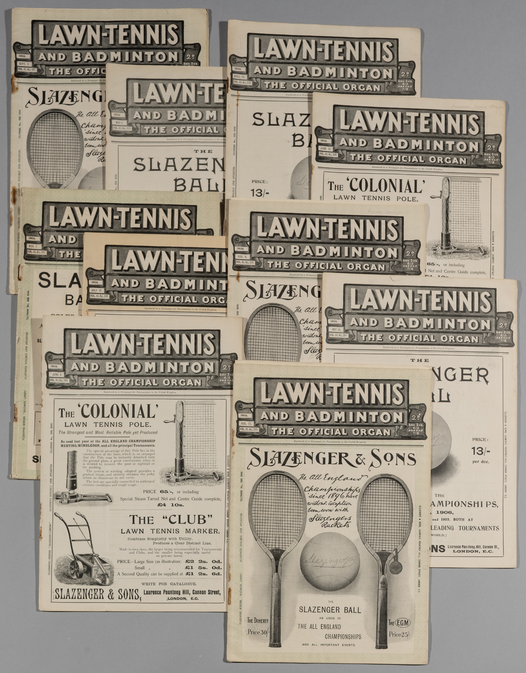 A collection of ten early editions of “The Lawn Tennis and Badminton magazine, circa 1906, containing interesting club and player articles and adverts for Slazengers, Sykes, Williams etc., some rusting to staples, (10)