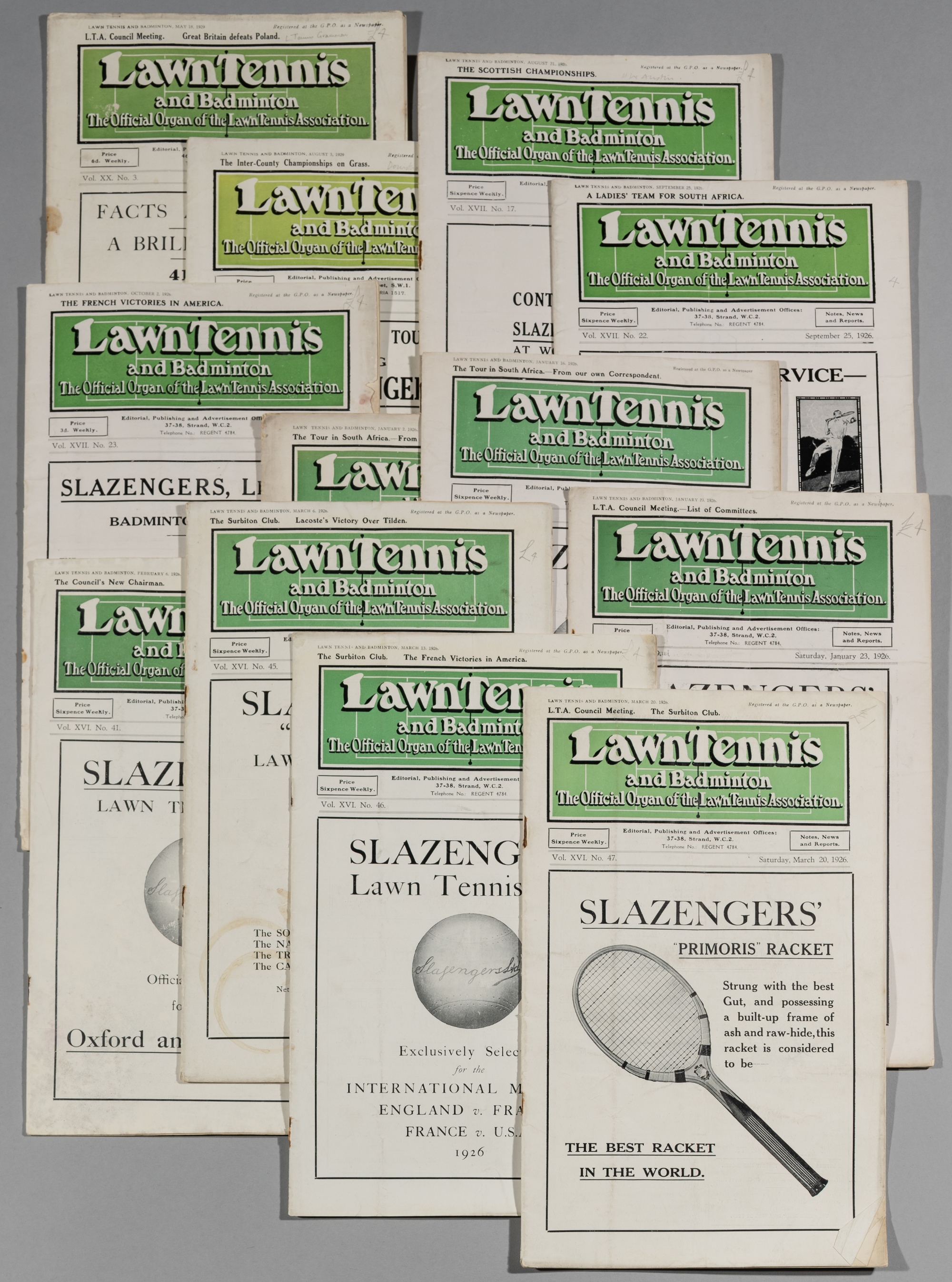 Twelve copies of “The Lawn Tennis and Badminton Magazine”, circa 1926, containing page adverts for Bussey, Ayres, Gradidge, tournament results and player profiles, some rusting to staples, (12)