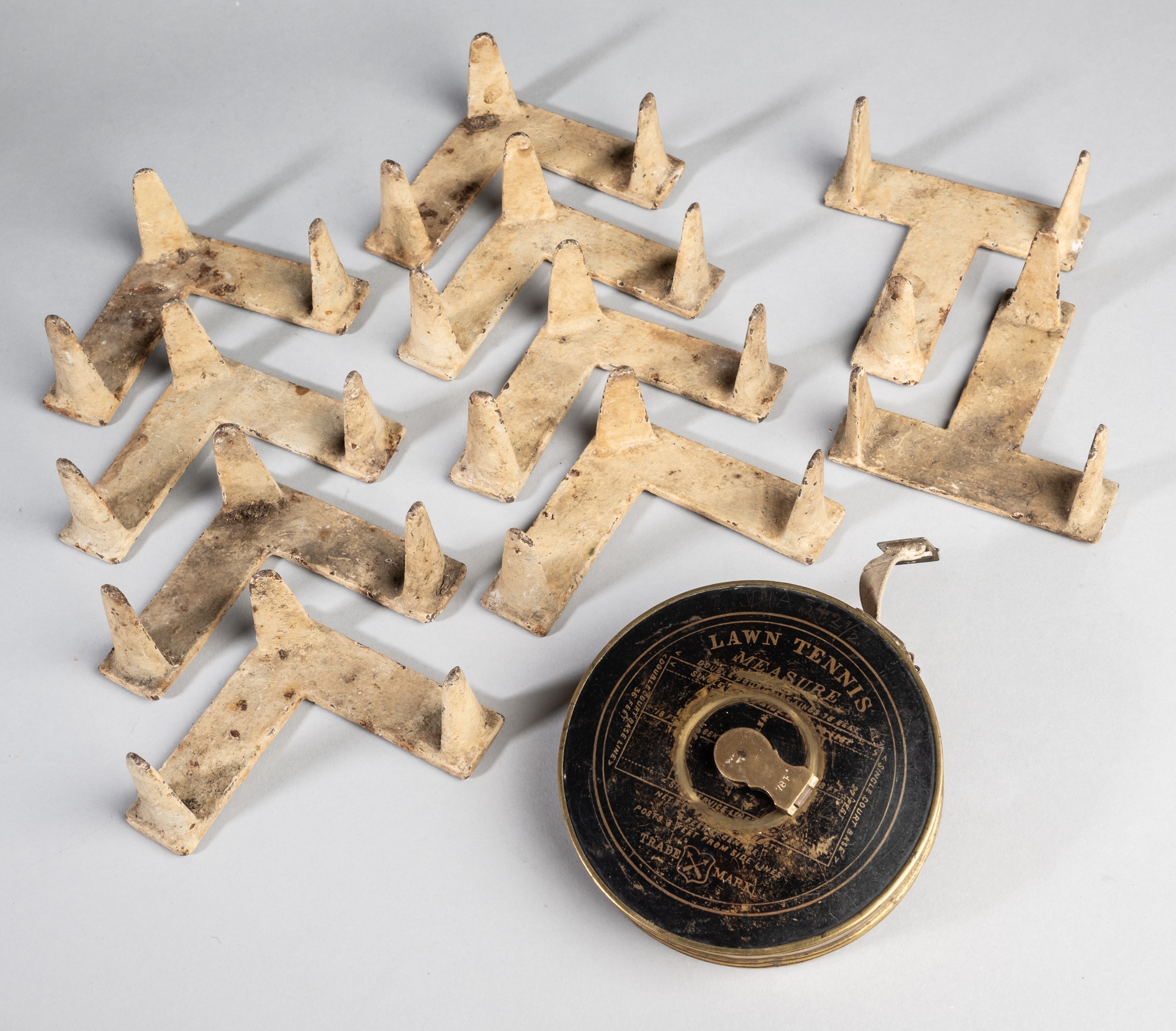 A set of ten grass court lawn tennis markers by F.H. Ayres of London, 10 by 10cm, eight corner markers and two T's, sold together with a brass lawn tennis measure with plan of the court, (11)