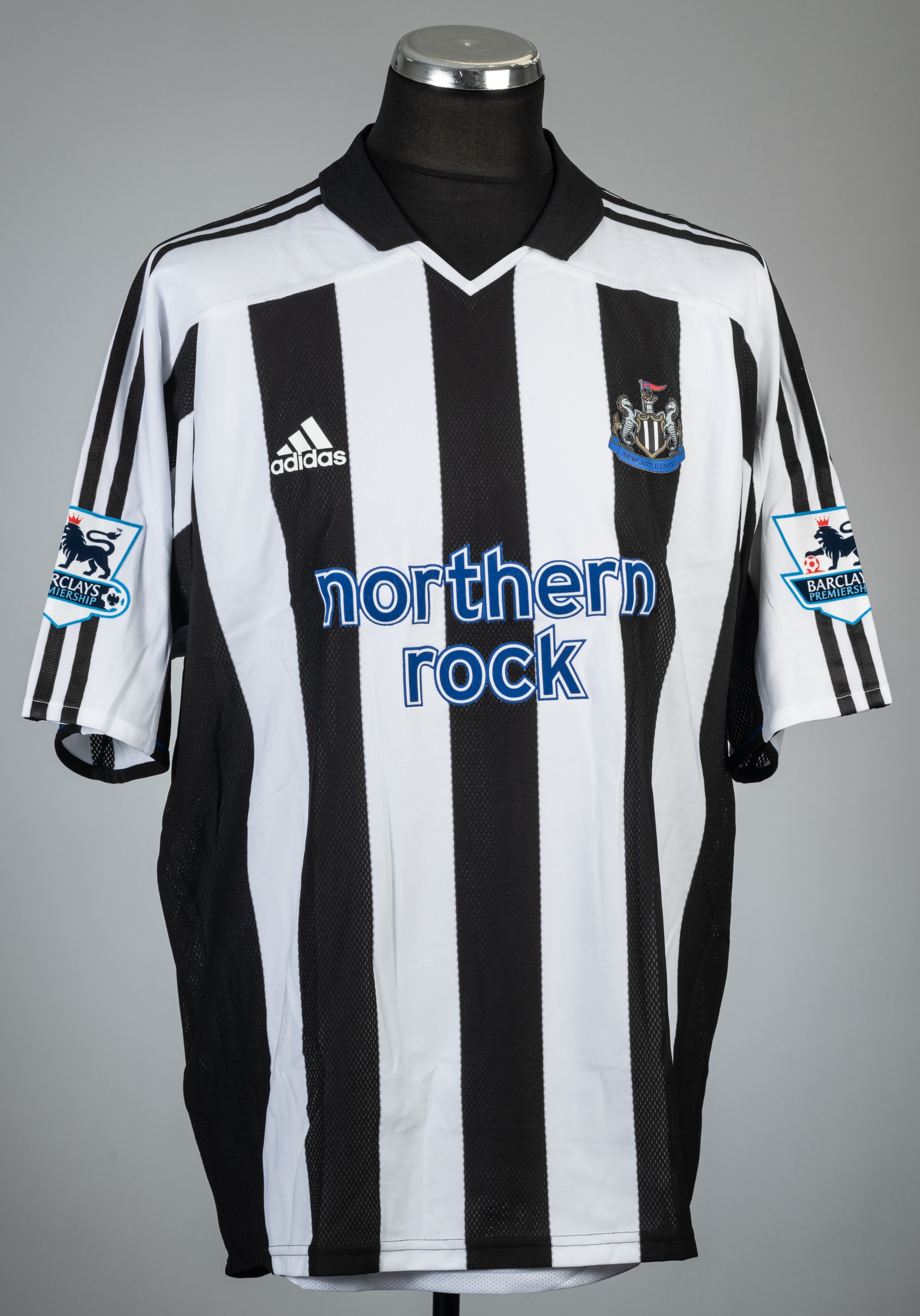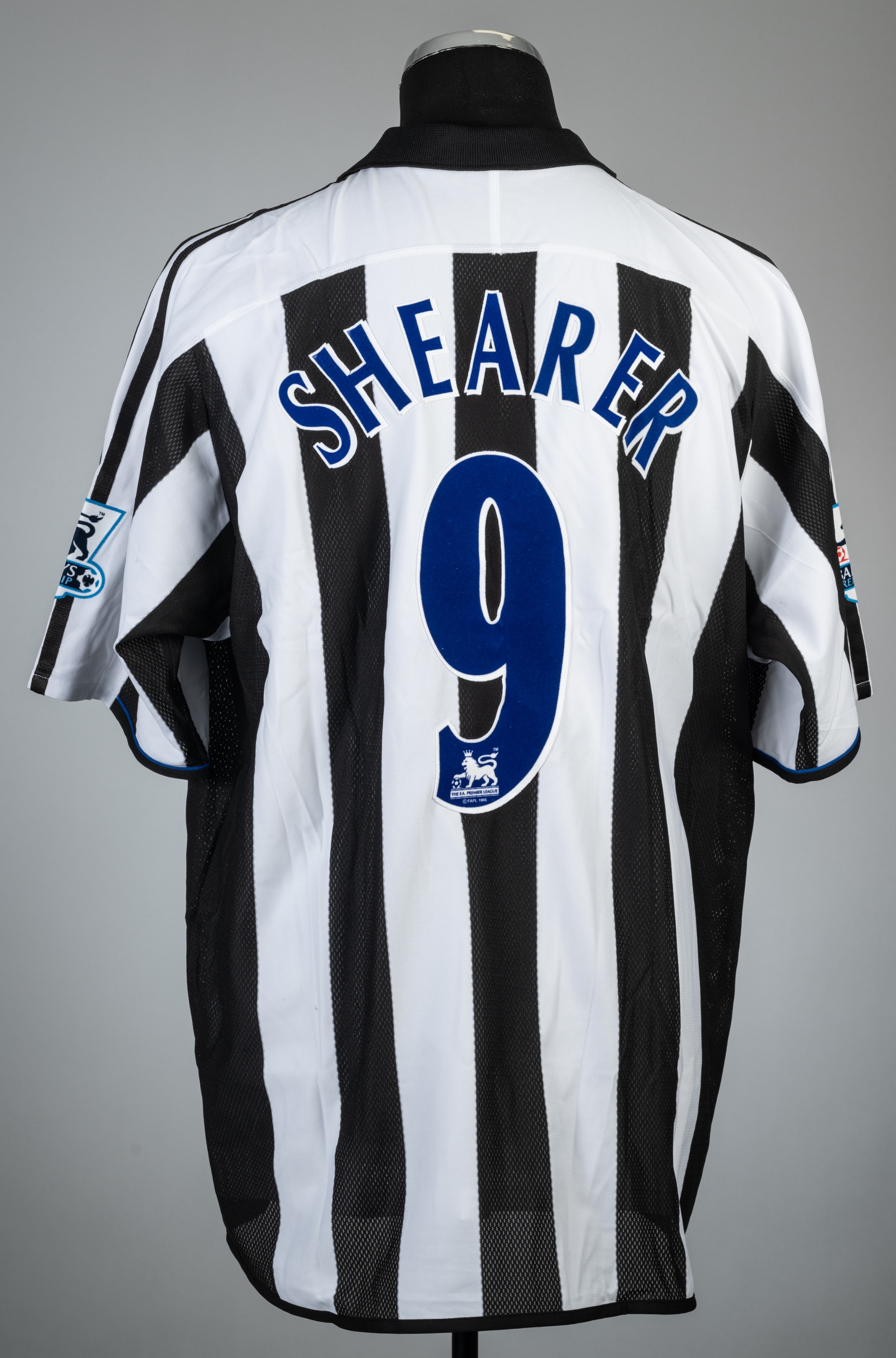 Alan Shearer black and white striped Newcastle United no.9 home jersey, season 2003-04, Adidas, short-sleeved with BARCLAYS PREMIER LEAGUE sleeve badges, club crest and sponsor logo, reverse lettered SHEARER, size XL