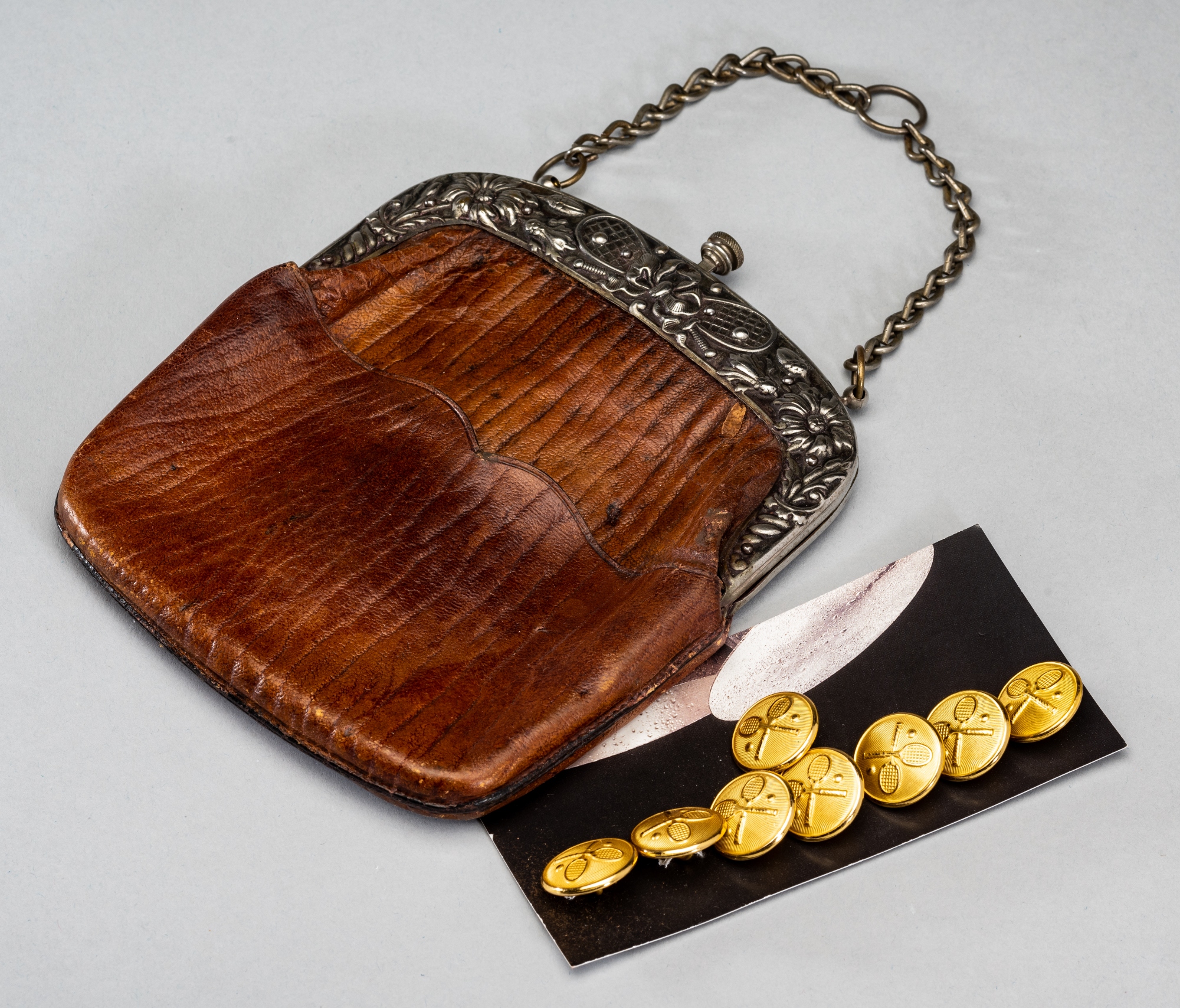 A Victorian Ladies’ tennis bag circa 1890, with white metal crossed rackets motif, leather body and carrying chain, not hallmarked, bag bears wear and surface scratches, sold together with a set of eight men’s gilt metal blazer buttons, (9)
