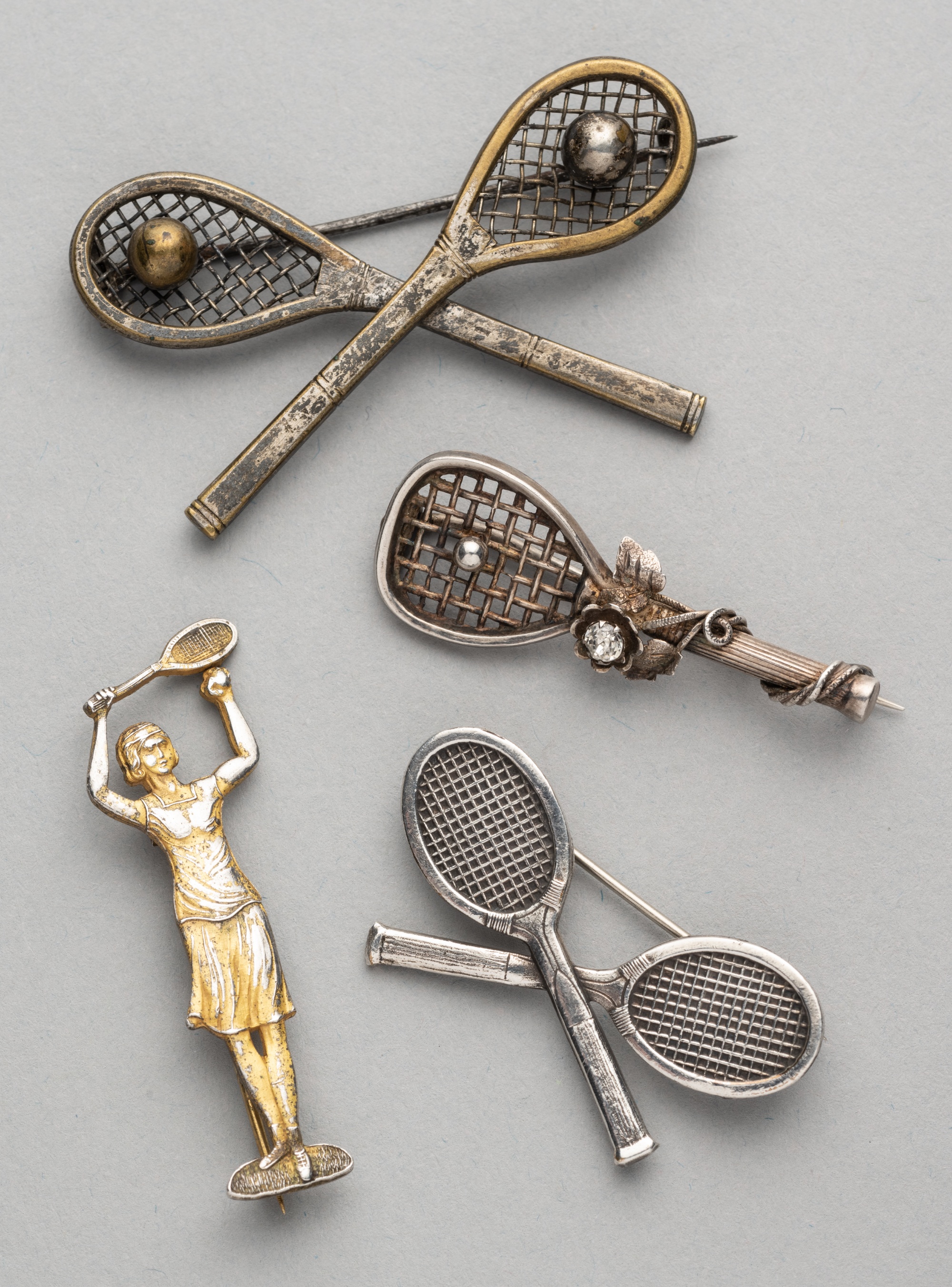 Four tennis brooches, comprising three white metal brooches, two of crossed racquets with pin clasp on reverse, one of tennis racquet with tennis ball on strings, handle bearing rose entwined and the fourth white metal and yellow painted brooch of a female tennis player with racquet and ball, no visible hallmarks, (4)