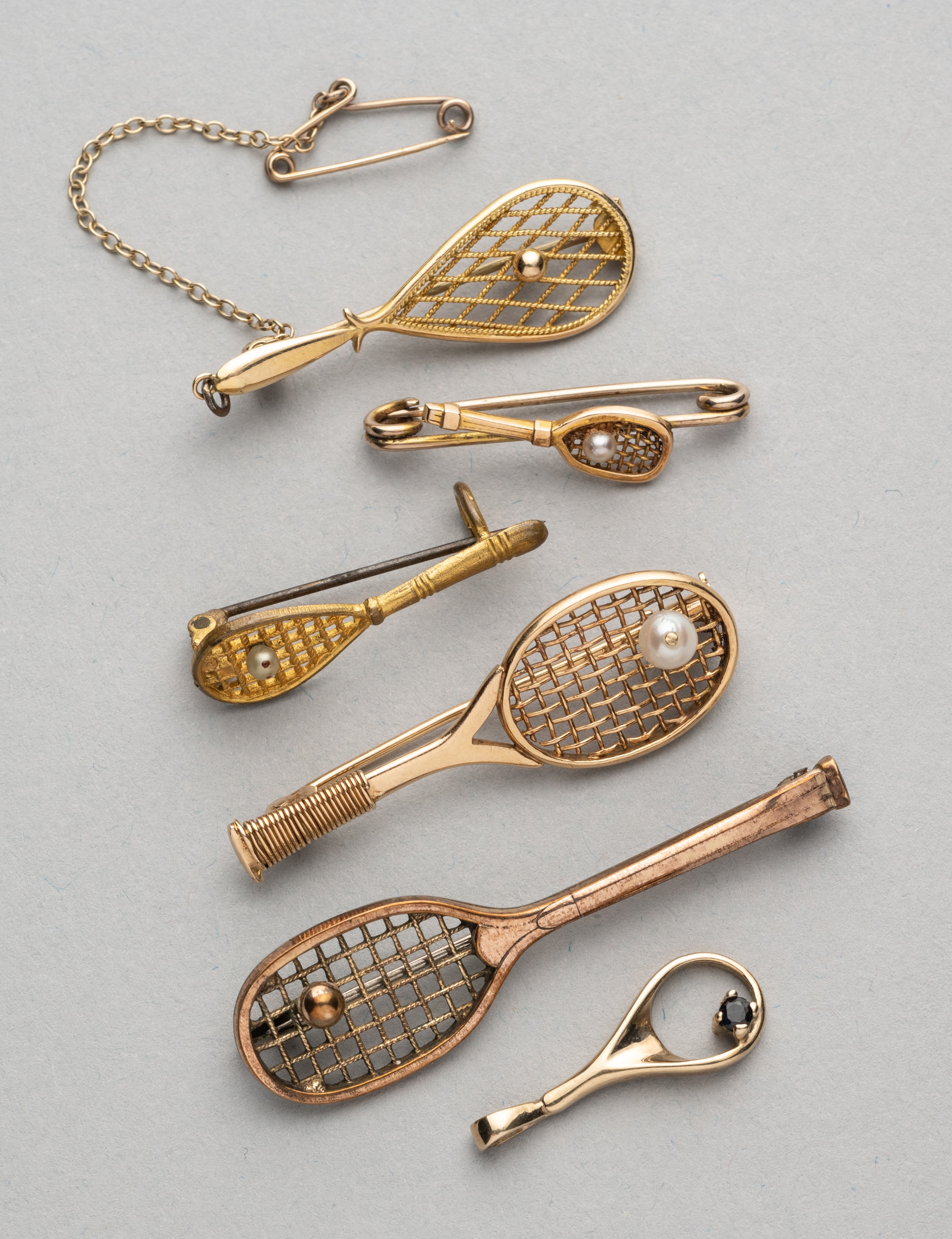 Five gilt metal tennis racquet brooches, two with gilt metal tennis ball on strings, three with single pearl on strings, and another with gemset ten