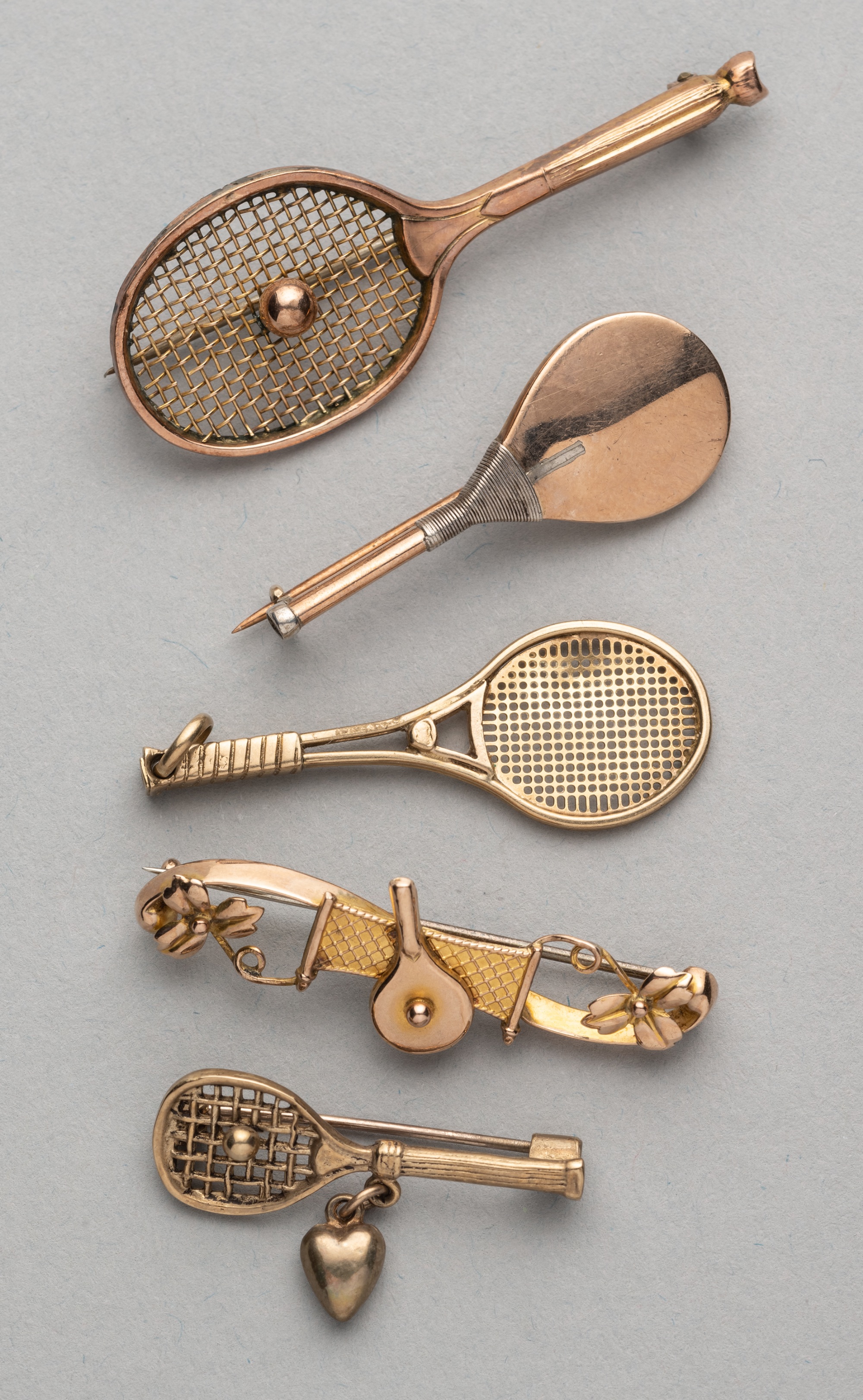 Four 9ct gold tennis racquet brooches, two featuring tennis ball on strings, one without and another of a racquet, ball and net, and the fifth of a