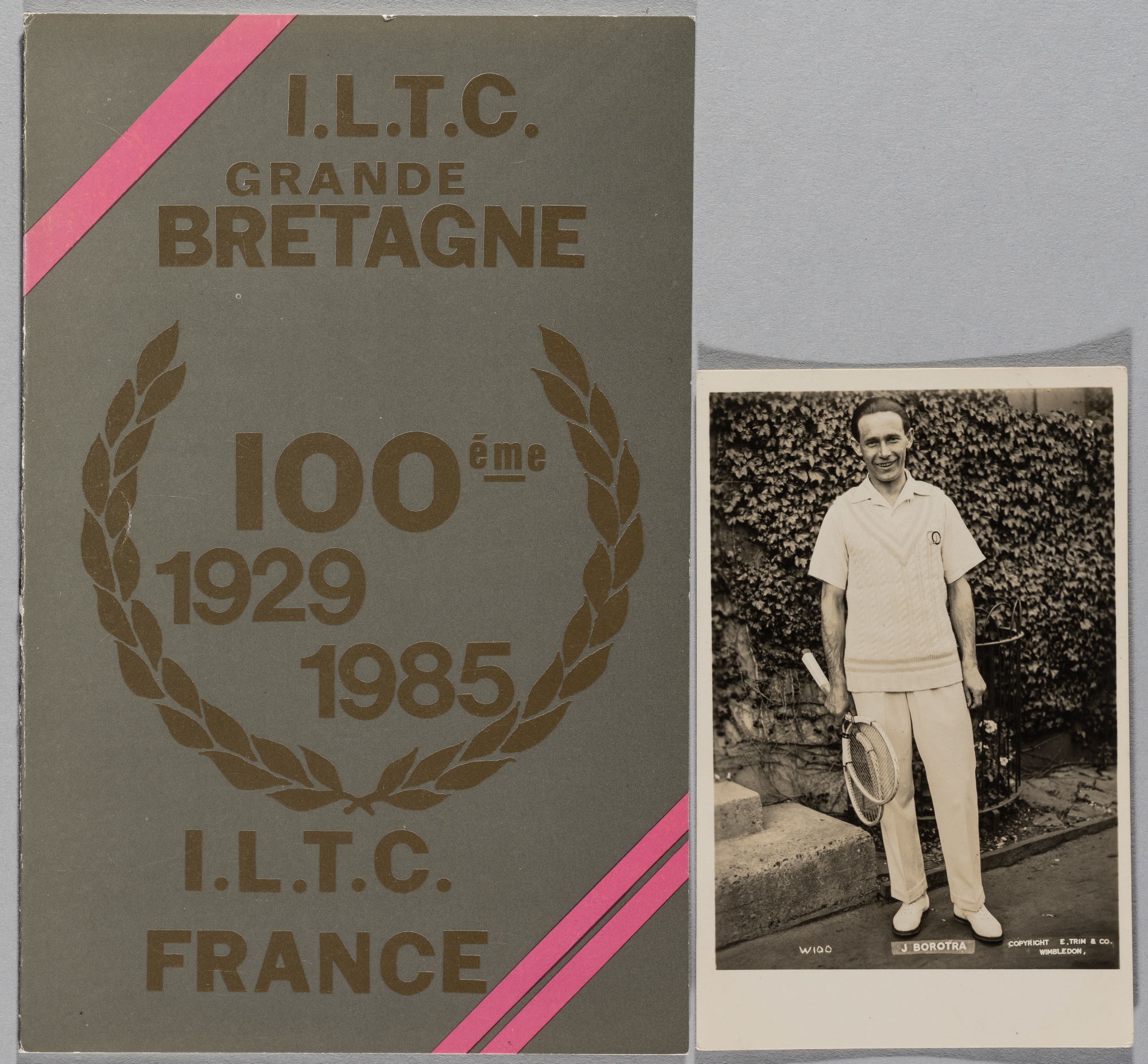 A rare tribute programme for Jean Borotra given by the International Tennis Clubs of Great Britain and France to celebrate the 1929-1985 tennis experiences of Jean Borotra, inside there is a poem in tribute by Alain Cassaigne and a caricature by Henry Zalzal, autographed by Borotra, sold together with a photographic card by Edwin Trim, (2)