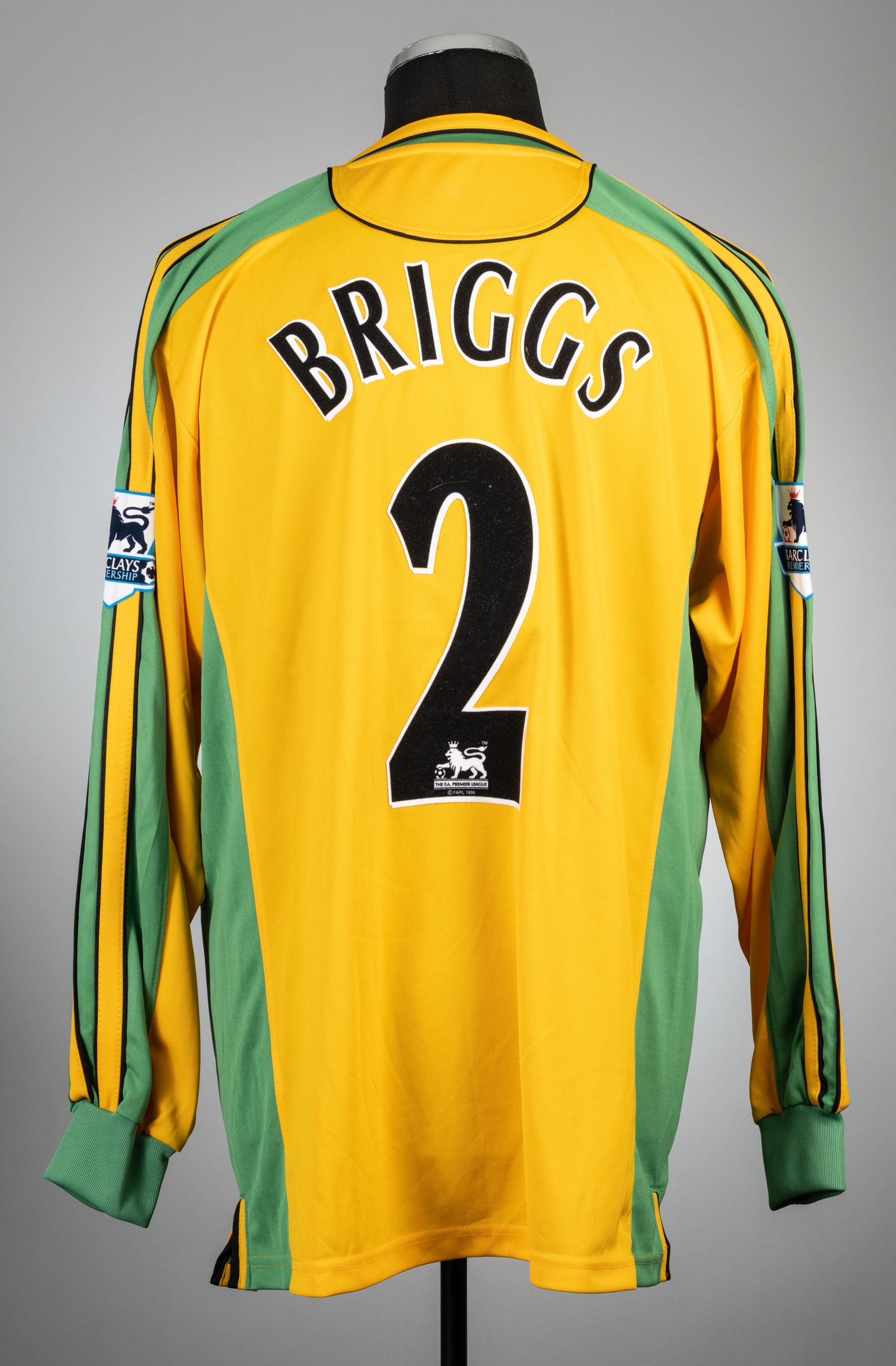 Keith Briggs yellow and green Norwich City no.2 home jersey, season 2003-04, Xara, long-sleeved with BARCLAYS PREMIERSHIP sleeve badges, club crest and sponsor logo, reverse lettered BRIGGS, size L