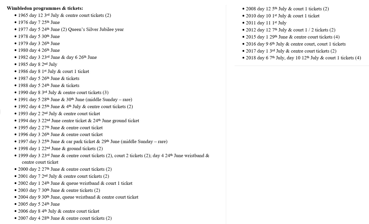 Collection of Wimbledon tennis programmes, dating from 1960's onwards, comprising Wimbledon programmes dating two from 23rd June to 6th July 1986, one bearing signatures; two from 22nd June to 5th July 1987, one bears signatures; two from 20th June to 3rd July 1988, one bearing signatures; an album of photographs from Wimbledon 1986 and further programmes, see images for a listing of the programmes included in this lot, various conditions, (qty)
