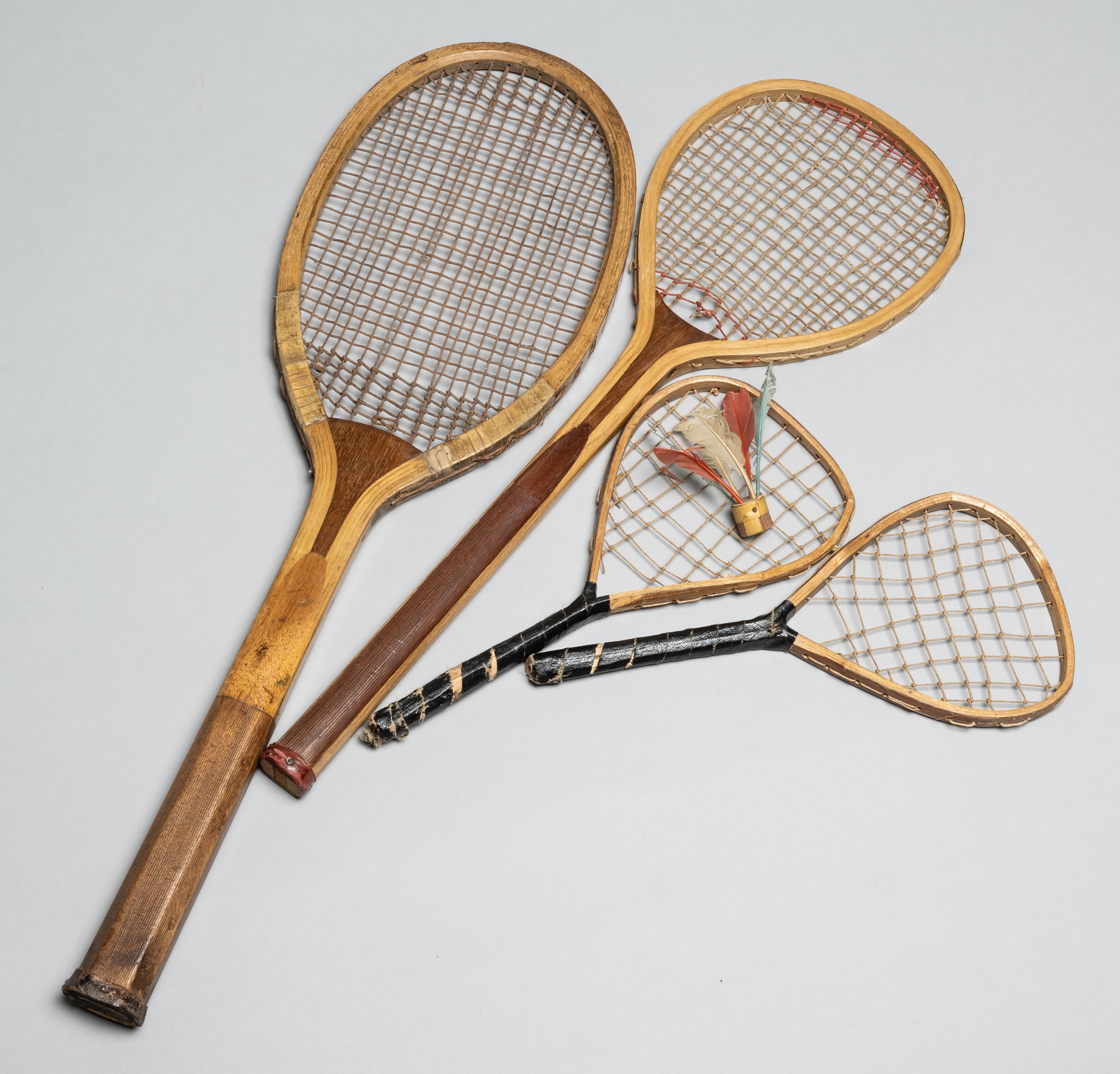 Champion Driva tennis racquet by Williams & Sons of Paris, circa 1910, excellent condition with no breaks; sold together with an interesting racquet with round head, 62 by 10cm and a small pair of play racquets and very early shuttlecock, (5)