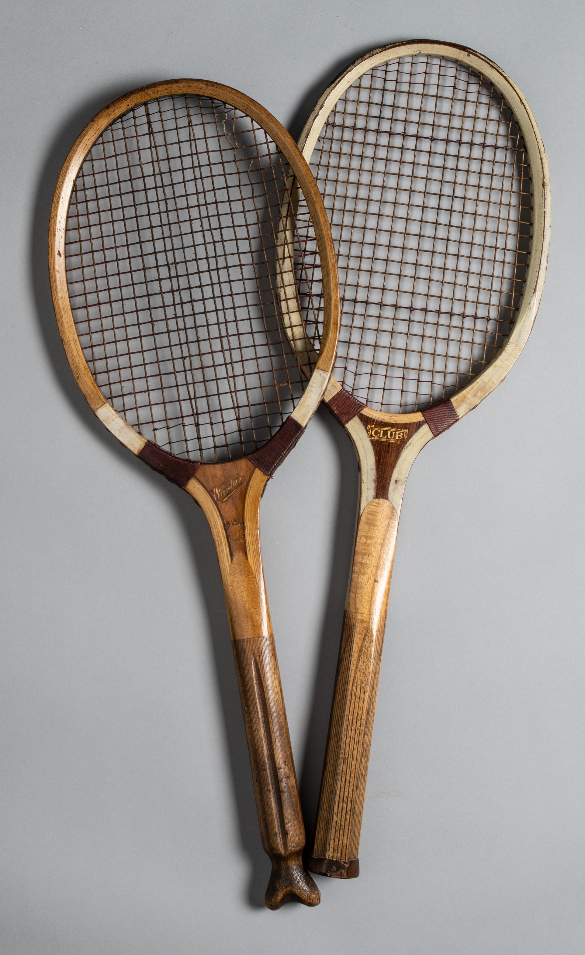 A very good fishtail tennis racket “The Windsor” circa 1920, with only two breaks to the bi-colour strings and “The Club” racket, circa 1900, in exc