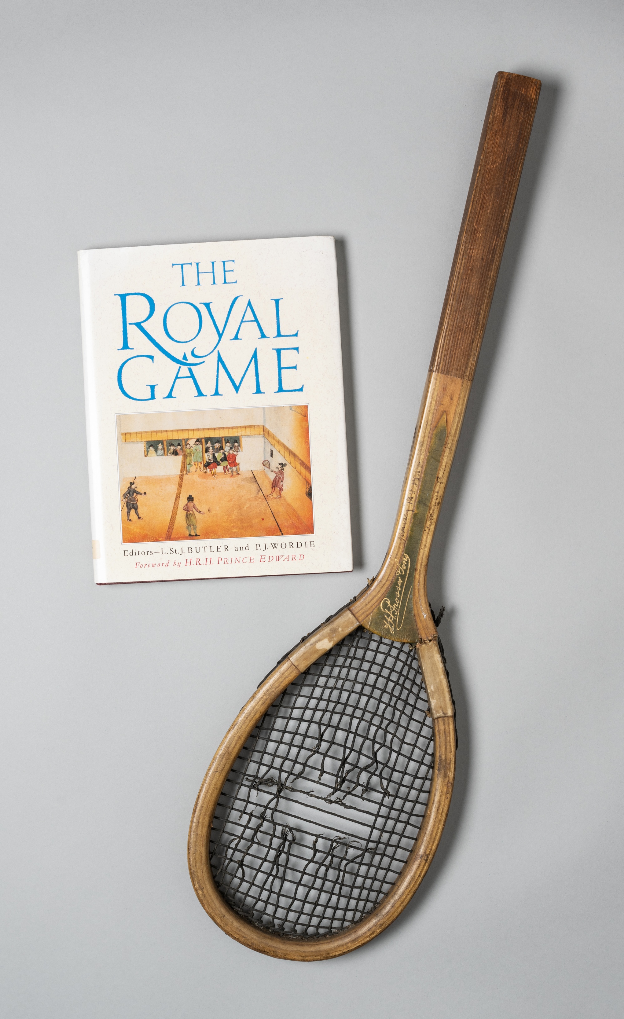 J.H. Prosser & Sons real tennis racquet, circa 1890, royal tennis, green vellum convex wedge square, thick gut strings, ridged handle, bears JH PROSSER & SONS, 548 HOLLOWAY ROAD LONDON, MADE IN ENGLAND stamps, frame damaged and central strings damaged, length 68.5cm; sold together with "The Royal Game" edited by Butler, L. St. J. and Wordle, P.J., hardback with d/j, 144-page, with illustrations and text; two copies of "Some notes on the Royal Tennis Court Hampton Court Palace, 3rd edition 1958, 8-page, bearing some written annotation in pen and pencil (2); "The Royal Tennis Court Hampton Court Palace 12-page booklet; two invitations to The Hampton Court Real Tennis Classic 21st June 1997; and further copies of articles relating to Royal Tennis, (qty)